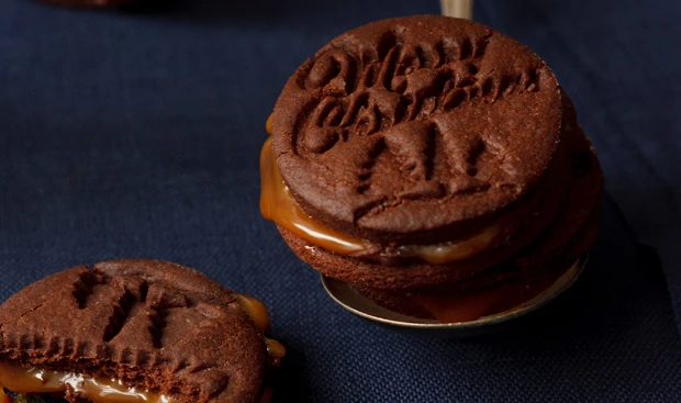Die Hälfte der Kekse mit Schokolade, die andere Hälfte mit Karamell bestreichen. Je einen Schoko- und Karamellkeks zusammensetzen.