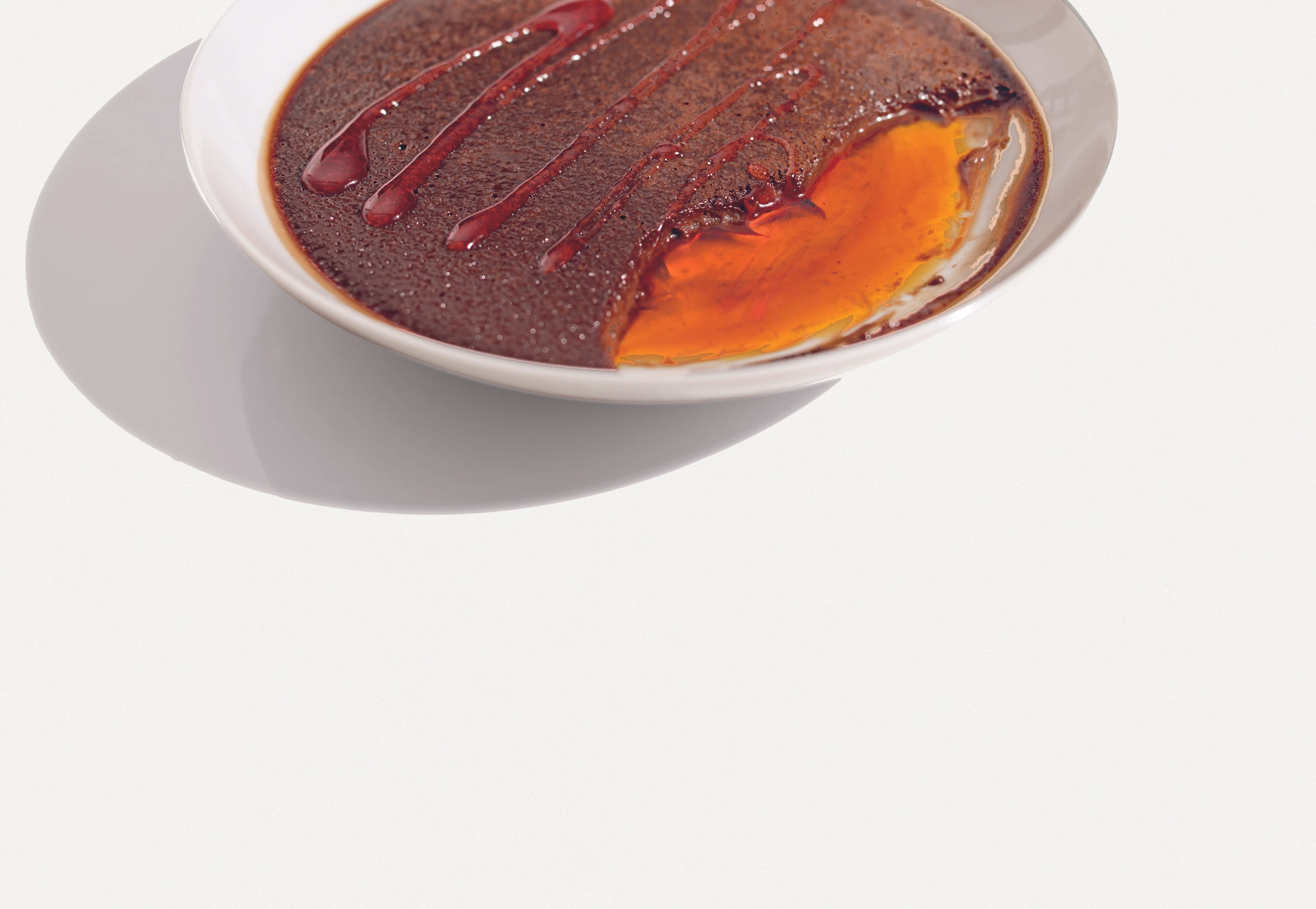 Ein tiefes Backblech mit Wasser füllen und ins Rohr (mittlere Schiene) schieben. Schoko-Karamell-Teller ins Wasserbad stellen und ca. 30 Minuten backen. Herausnehmen und für ca. 4 Stunden kalt stellen. Dessert mit Himbeersirup garniert servieren.