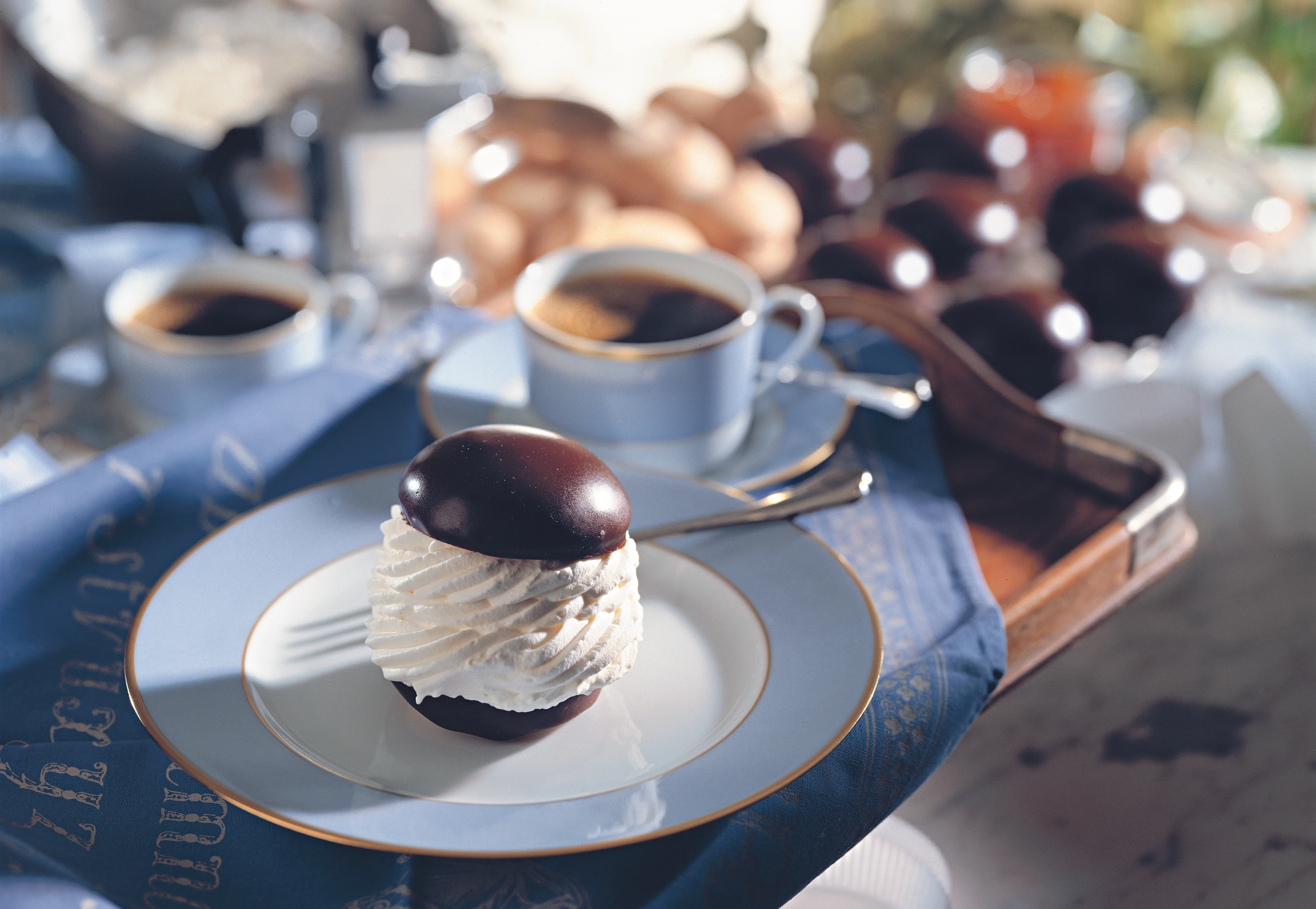 Unmittelbar vor dem Servieren Obers mit Zucker verrühren und aufschlagen. Die Unterteile in Papierkapseln setzen, mit dem Obers füllen (Dressiersack mit Sterntülle) und die glasierten Oberteile daraufsetzen.
