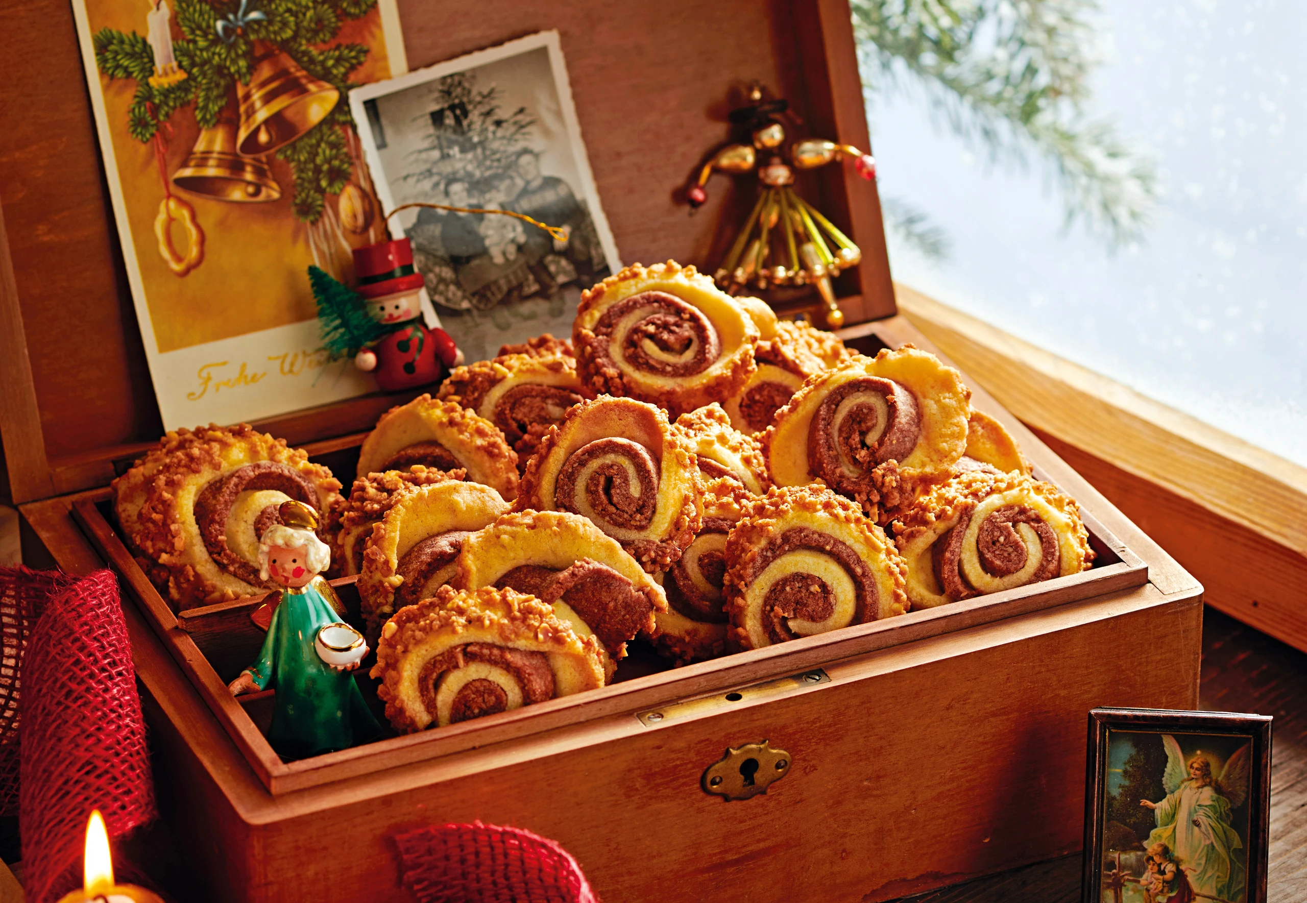 Teig horizontal halbieren. Jede Teighälfte dünn mit Eiklar bestreichen und der Länge nach eng einrollen. Teigrollen auf ein flaches Geschirr legen und für ca. 3 Stunden kalt stellen.