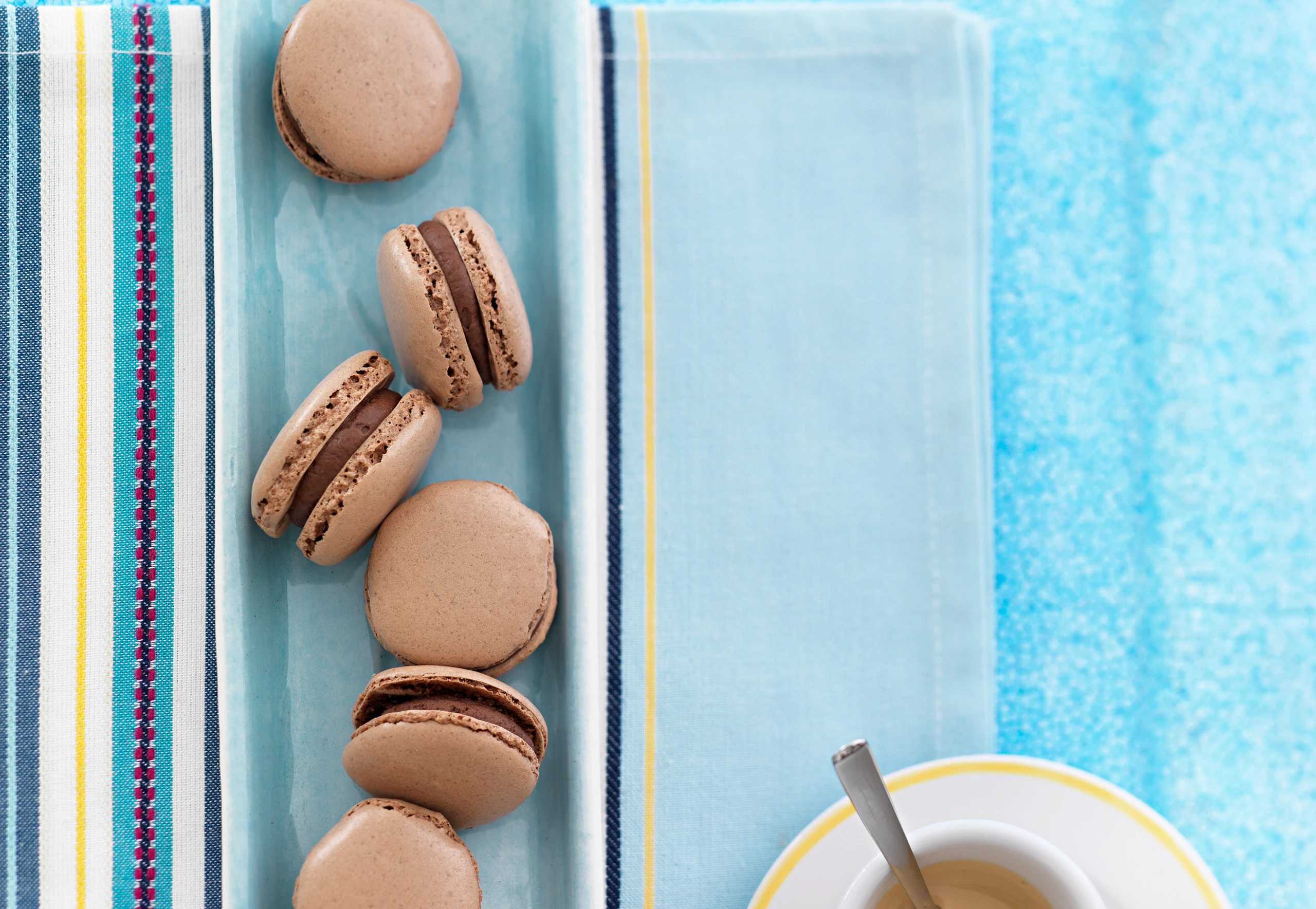 Makronen vom Backpapier lösen, die Hälfte davon umdrehen. Ganache auf-rühren, in einen Dressiersack mit glatter Tülle (Ø 4 mm) füllen und auf die Hälfte der Makronen dressieren. Übrige Mak-ronen daraufsetzten und etwas trocknen lassen.
