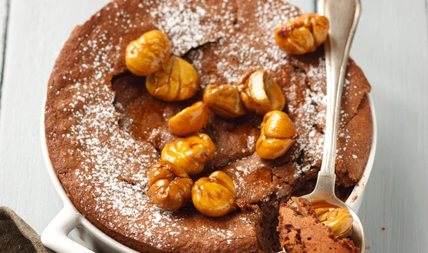 Für die Maroni 50 g Kristallzucker bis zur leichten Braunfärbung erhitzen. Maroni zugeben, schwenken und mit Orangensaft aufgießen. Flüssigkeit fast zur Gänze einkochen lassen. Auflauf aus dem Rohr nehmen, mit Staubzucker bestreuen und mit Maroni garniert servieren.