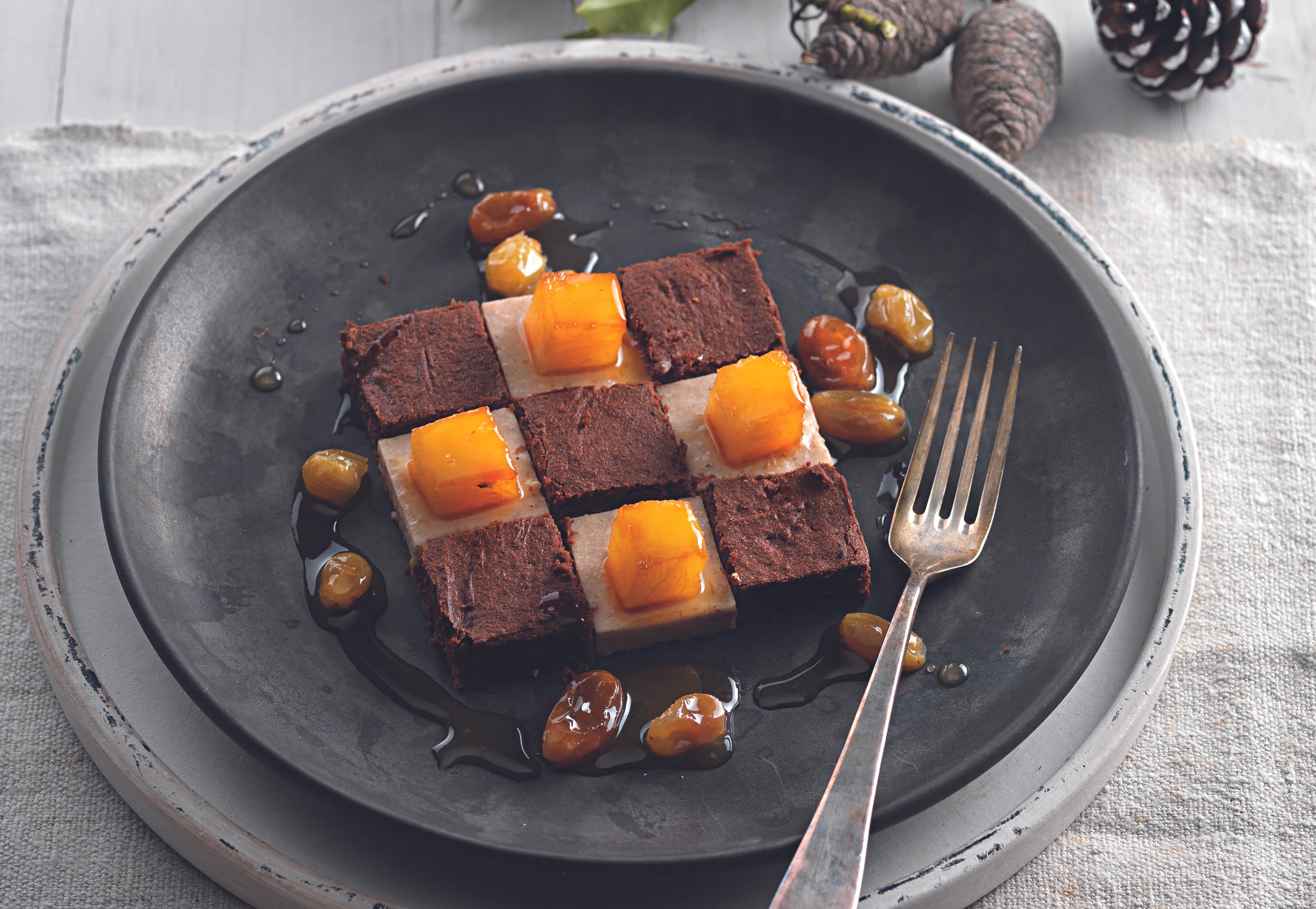 Kuchen und Maronimasse in ca. 3 x 3 cm große Stücke schneiden, wie ein Schachbrett anrichten und mit dem Kompott garnieren.
