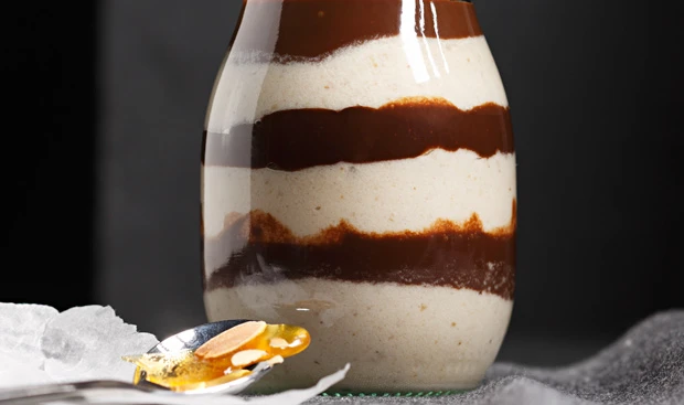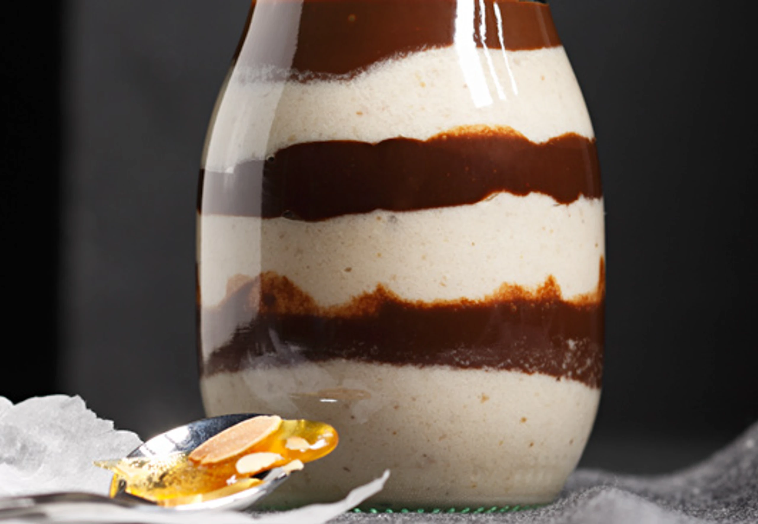 Maronimousse und Schokosauce abwechselnd in die Gläser füllen und für ca. 3 Stunden kühl stellen.