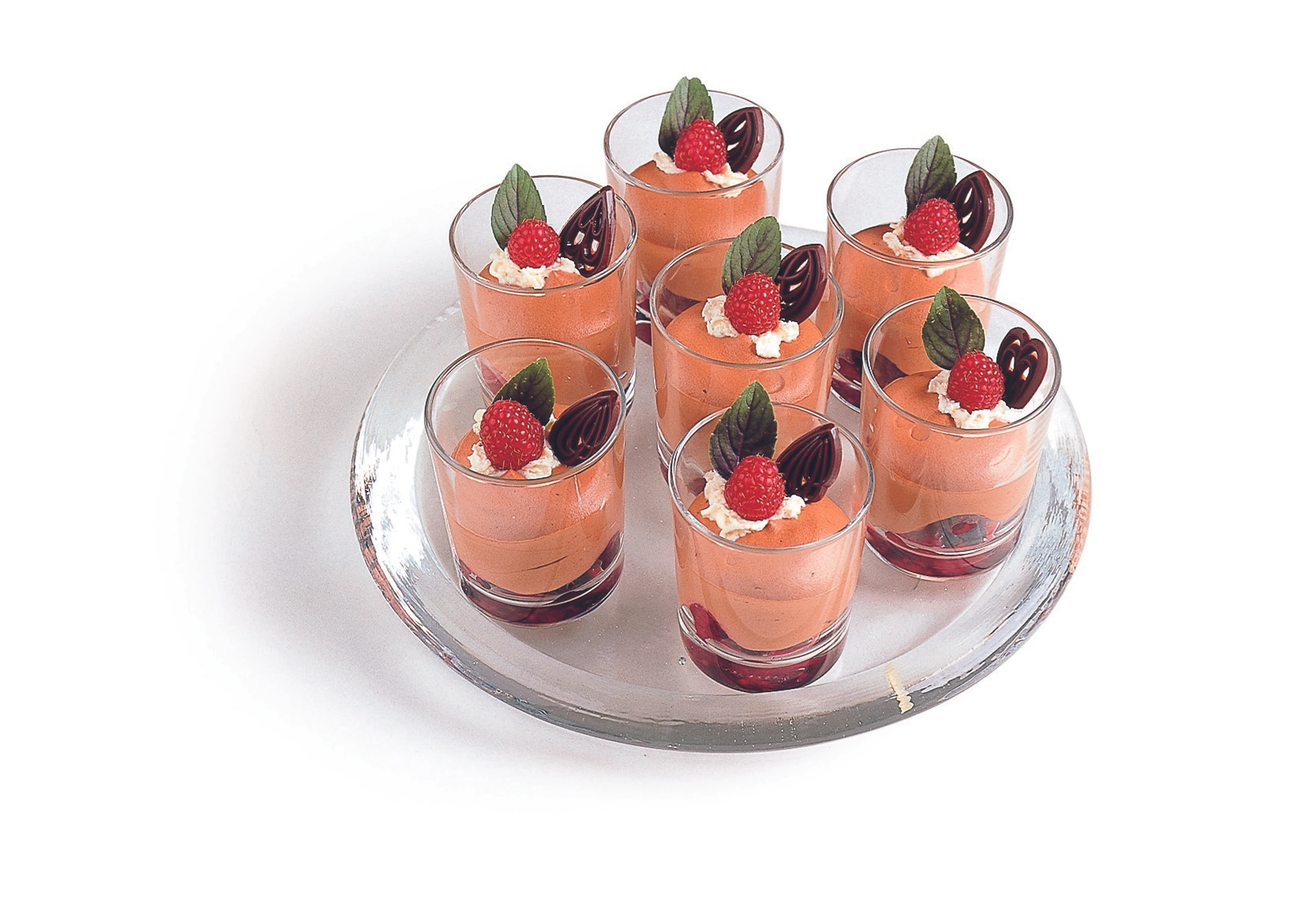 Mousse 30 Minuten vor dem Servieren aus dem Kühlschrank nehmen, mit Schlagobers, Früchten, Minze und Schokospänen dekorieren.