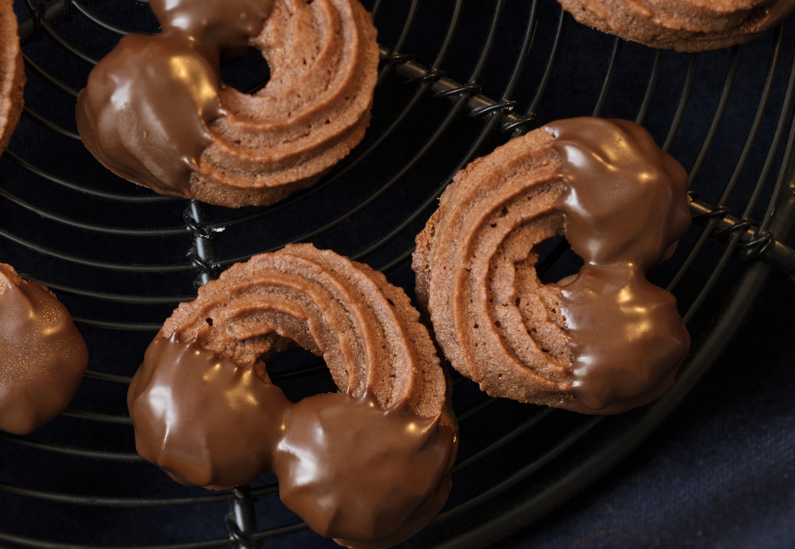 Butter sehr schaumig rühren (Küchenmaschine mind. 10 Minuten), nach und nach Staubzucker, Vanillemark, Orangenschale und Dotter unterrühren. Mehl, Backpulver, Kakao und Gewürze vermischen und unterheben.