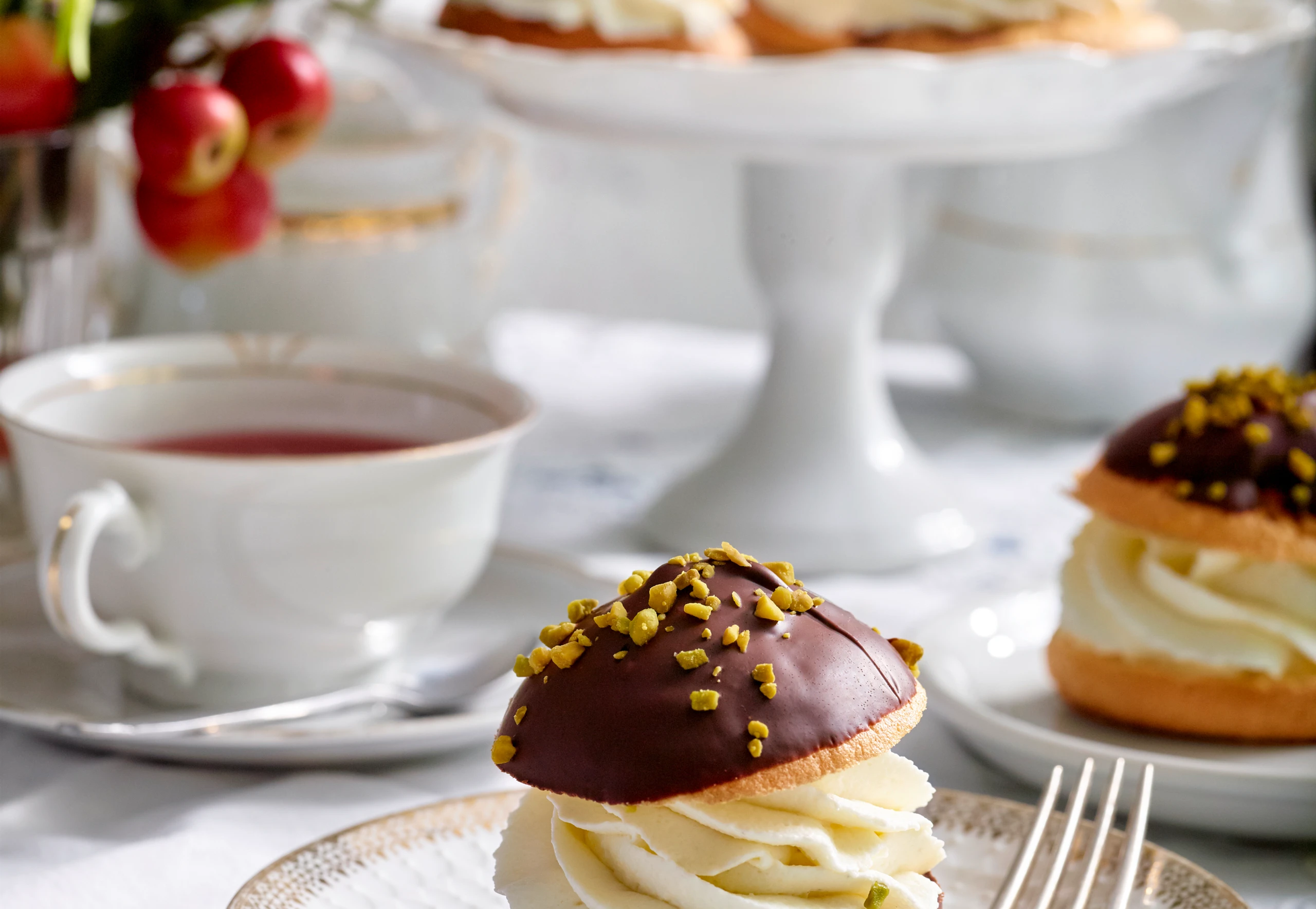 Für die Fülle Obers und Zucker cremig schlagen und in einen Dressiersack mit Sterntülle füllen. Krapferl halbieren und mit dem Vanilleobers füllen.