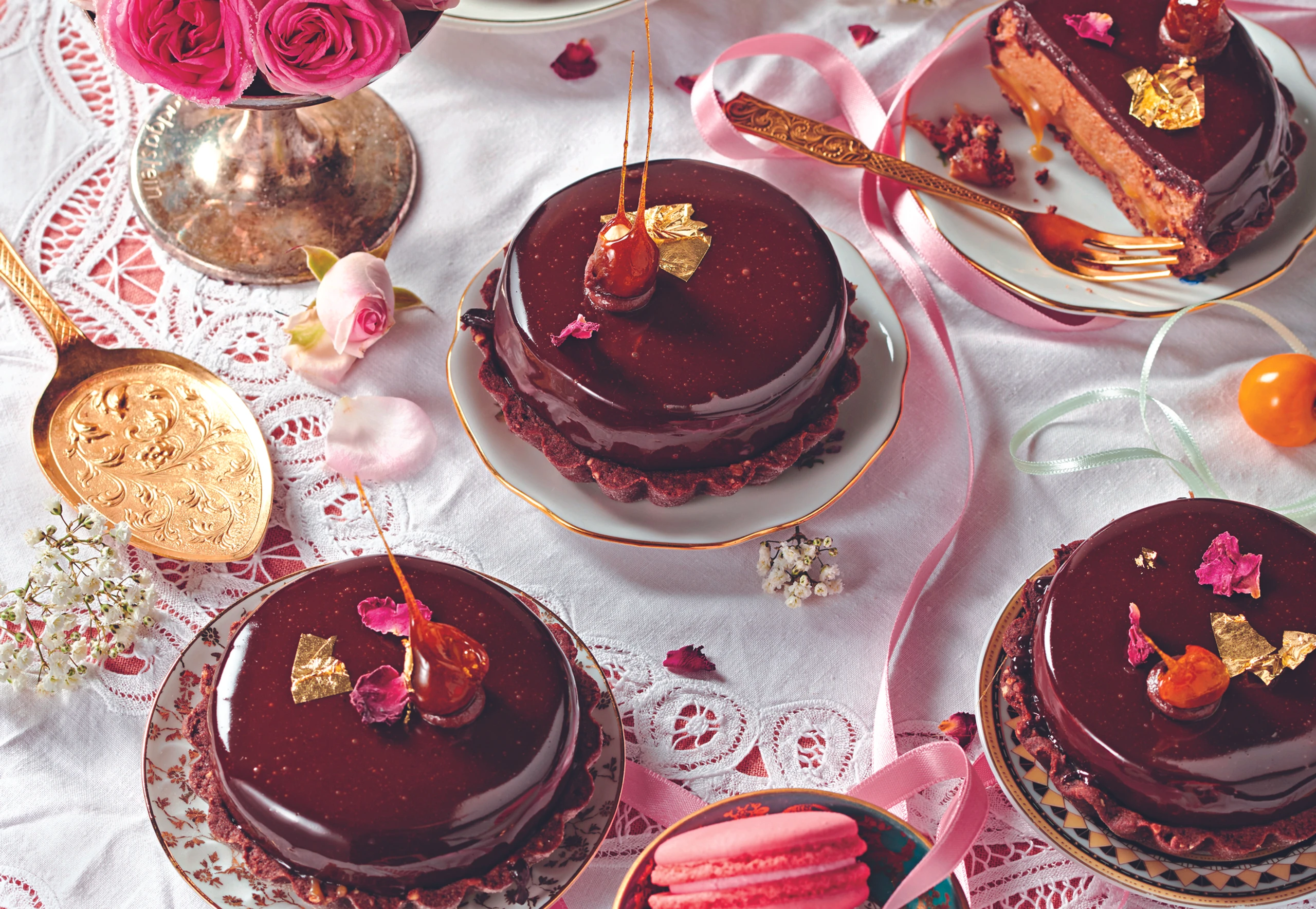 Nougatmousse aus den Ringen lösen, auf ein Gitter legen und mit der Glasur überziehen. Glasur trocknen lassen. Glasierte Mousse auf die Tartelettes legen. Tartelettes mit Nüssen, Gold und Rosenblättern dekorieren. Bei Raumtemperatur ca. 1 Stunde auftauen lassen.