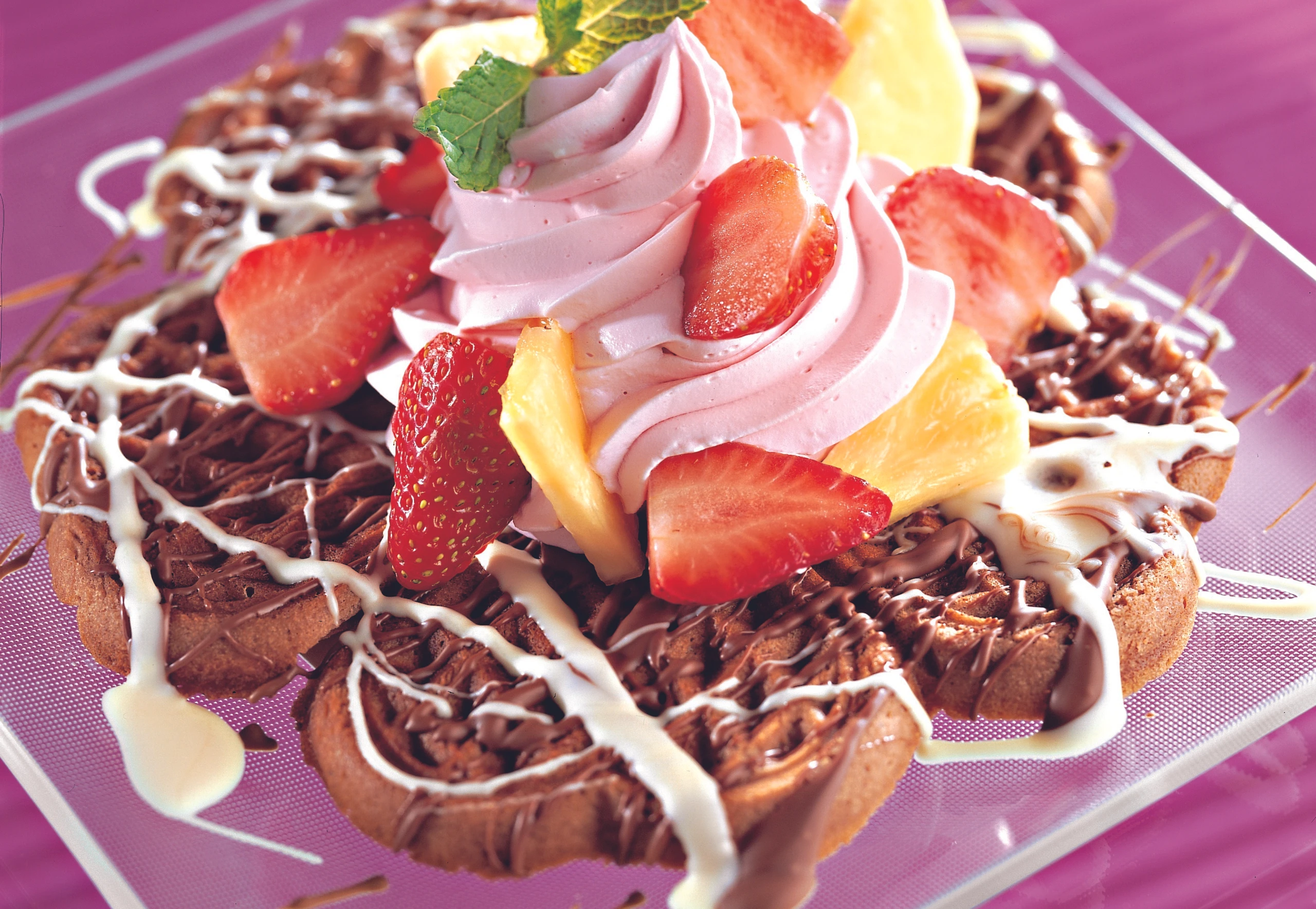 Erdbeeren putzen. Erdbeeren und Ananas in Stücke schneiden. Waffeln mit Schokolade beträufeln und mit Früchten belegen. Creme mit einem Dressiersack mit Sterntülle darauf dressieren. Waffeln mit Minze garniert servieren.
