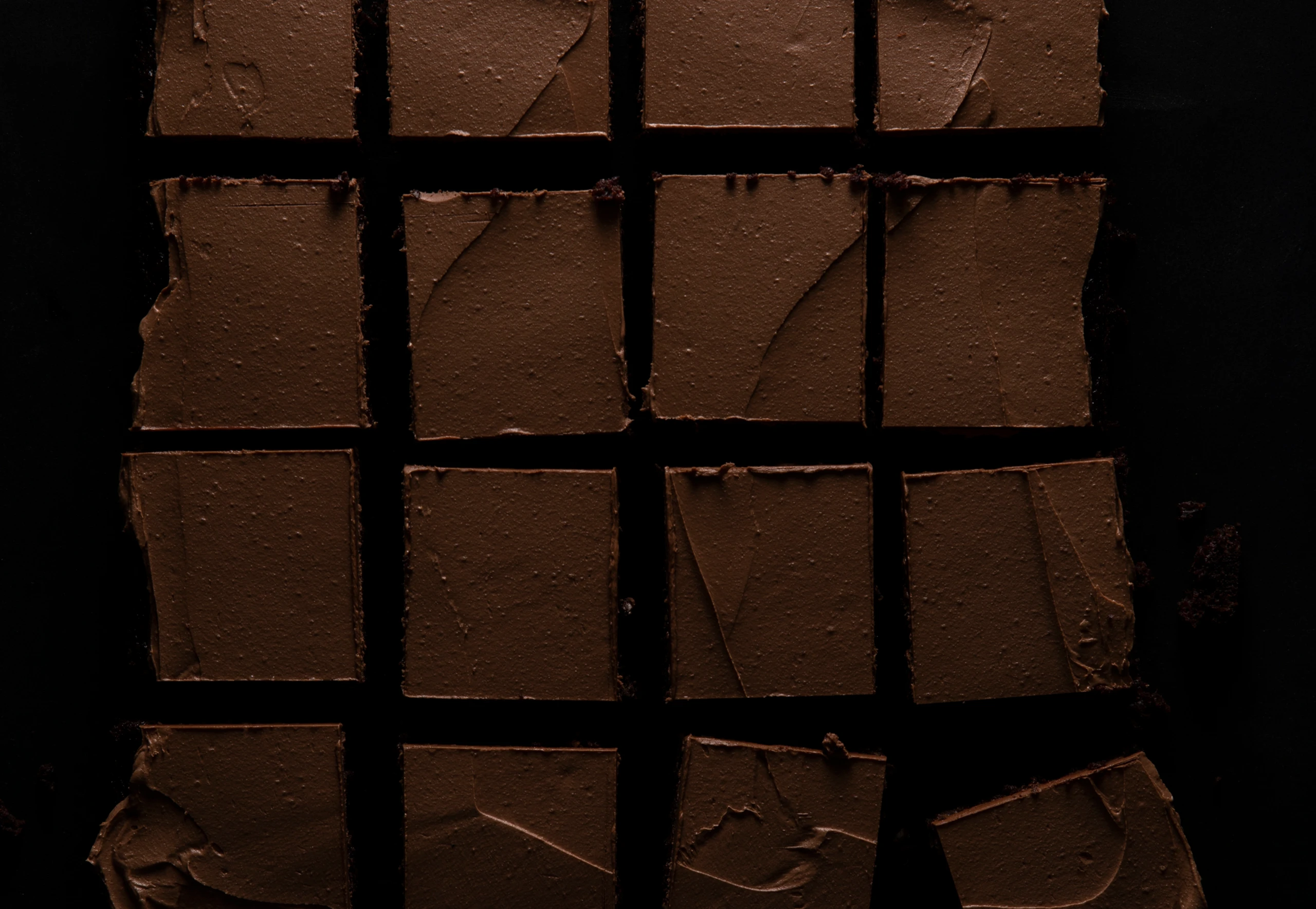 Kuvertüre untermischen. Creme auf dem Kuchen verstreichen. Schokobananenkuchen in Stücke schneiden und servieren.