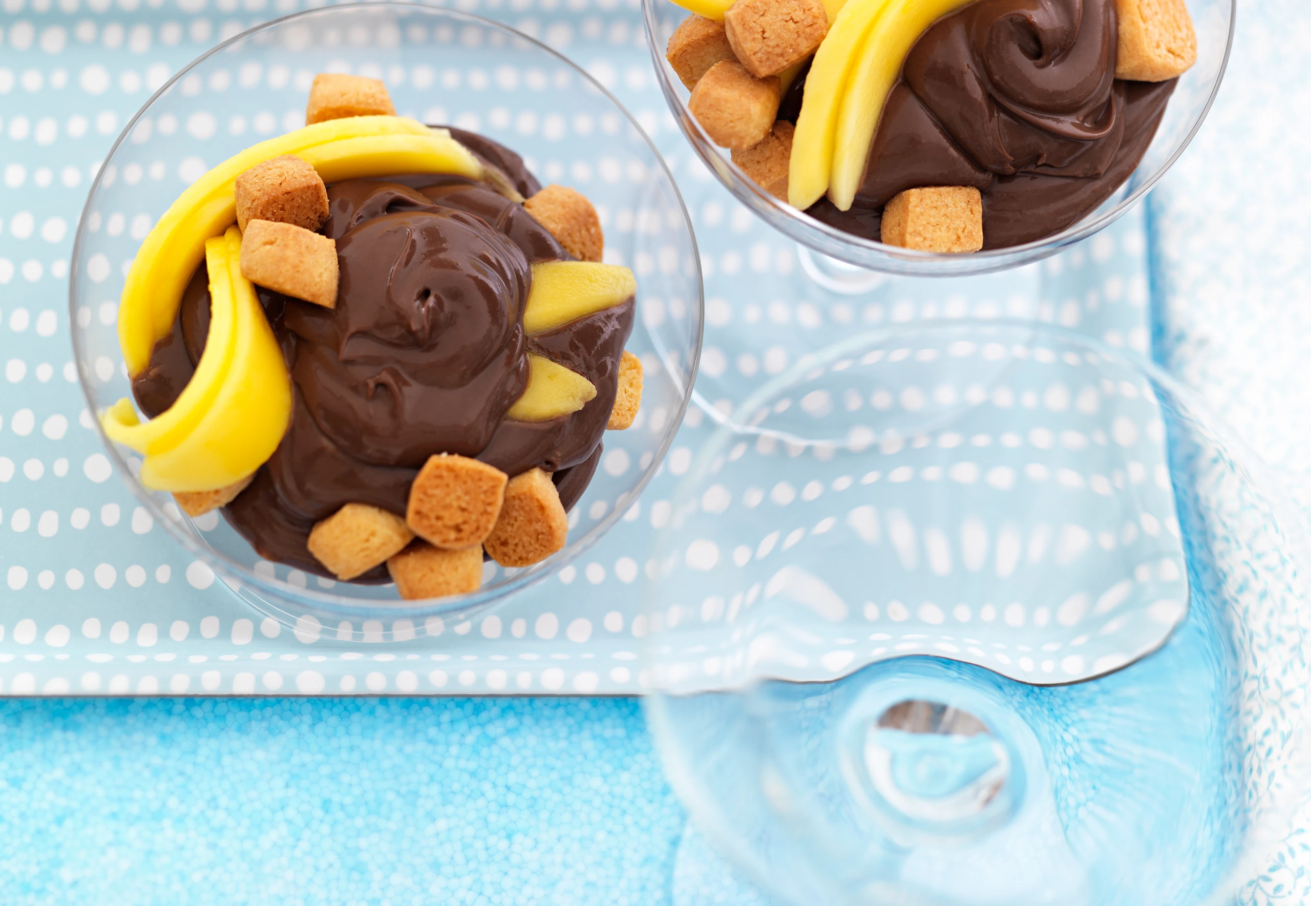 Schokocreme mit Mürbteigwürfeln und Mangostreifen