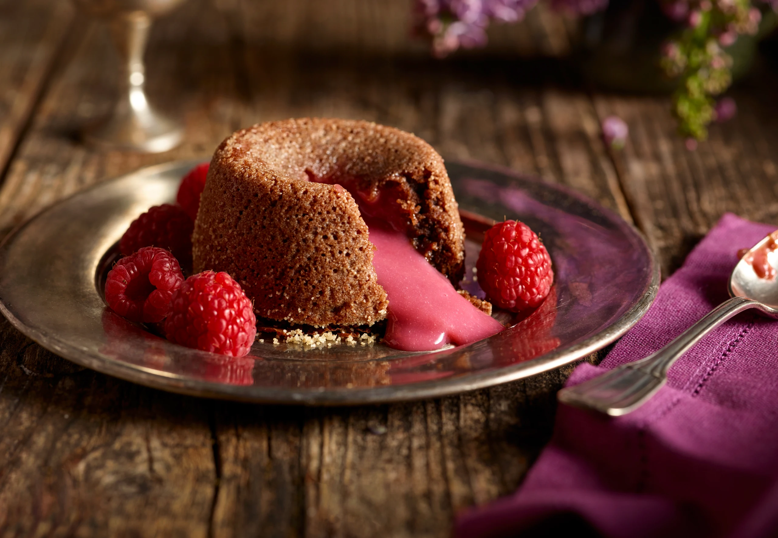 Die Hälfte der Schokomasse in die Förmchen füllen und je 1 TL von der Himbeercanache in die Mitte setzen. Förmchen mit der übrigen Schokomasse auffüllen. Küchlein im Rohr (mittlere Schiene) 10 Minuten backen.