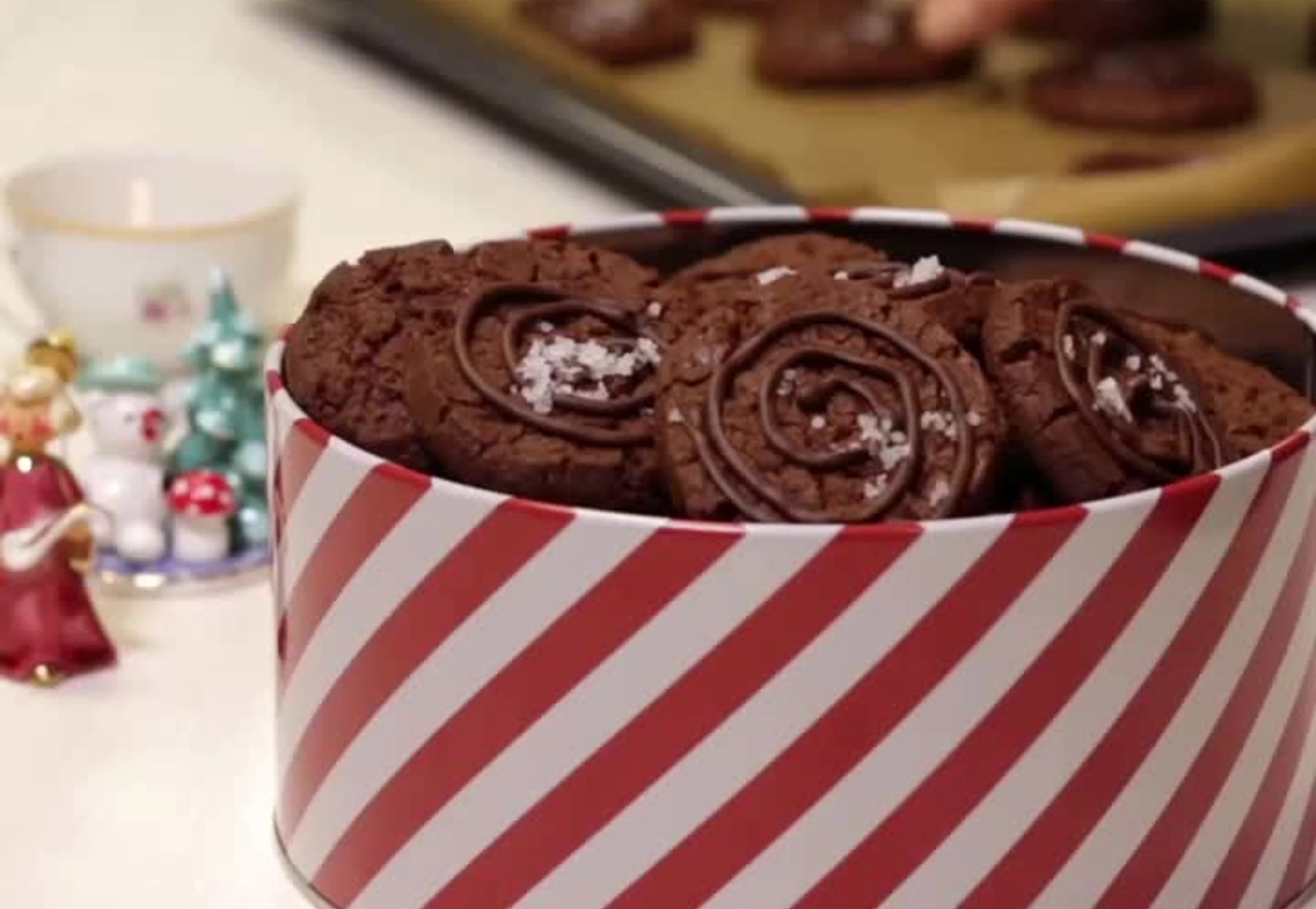 Kuvertüre in ein Stanitzel oder einen Dressiersack füllen und die Kekse damit verzieren. Jeden Keks mit 1 Prise Fleur de Sel bestreuen.