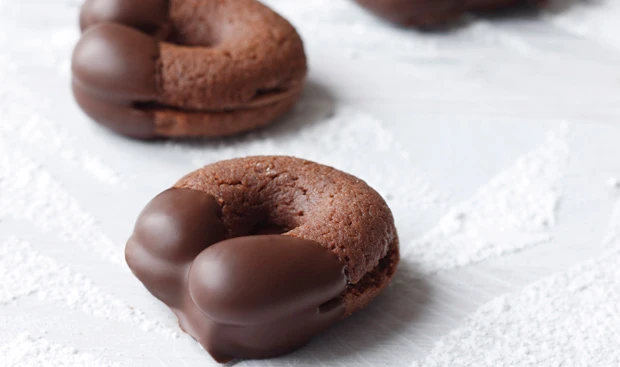 Rohr auf 170°C vorheizen. 2 Backbleche mit Backpapier belegen. Butter schaumig rühren (Küchenmaschine ca. 5, Handmixer ca. 10 Minuten). Zucker, Vanille und Dotter nach und nach unterrühren. Mehl, Backpulver und Kakao versieben und löffelweise unterrühren.