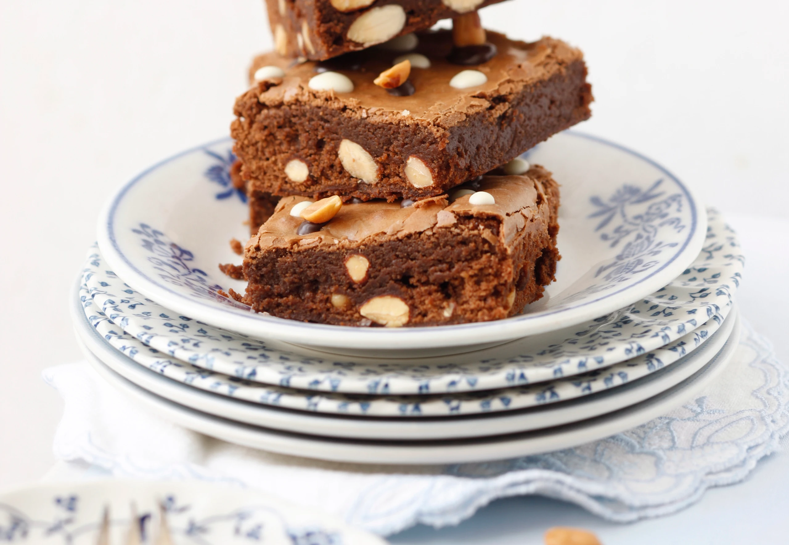Für die Garnitur Kuvertüren getrennt über Dampf schmelzen, in ein Papierstanitzel füllen, auf dem Kuchen punktförmig verteilen und mit restlichen Erdnüssen garnieren.