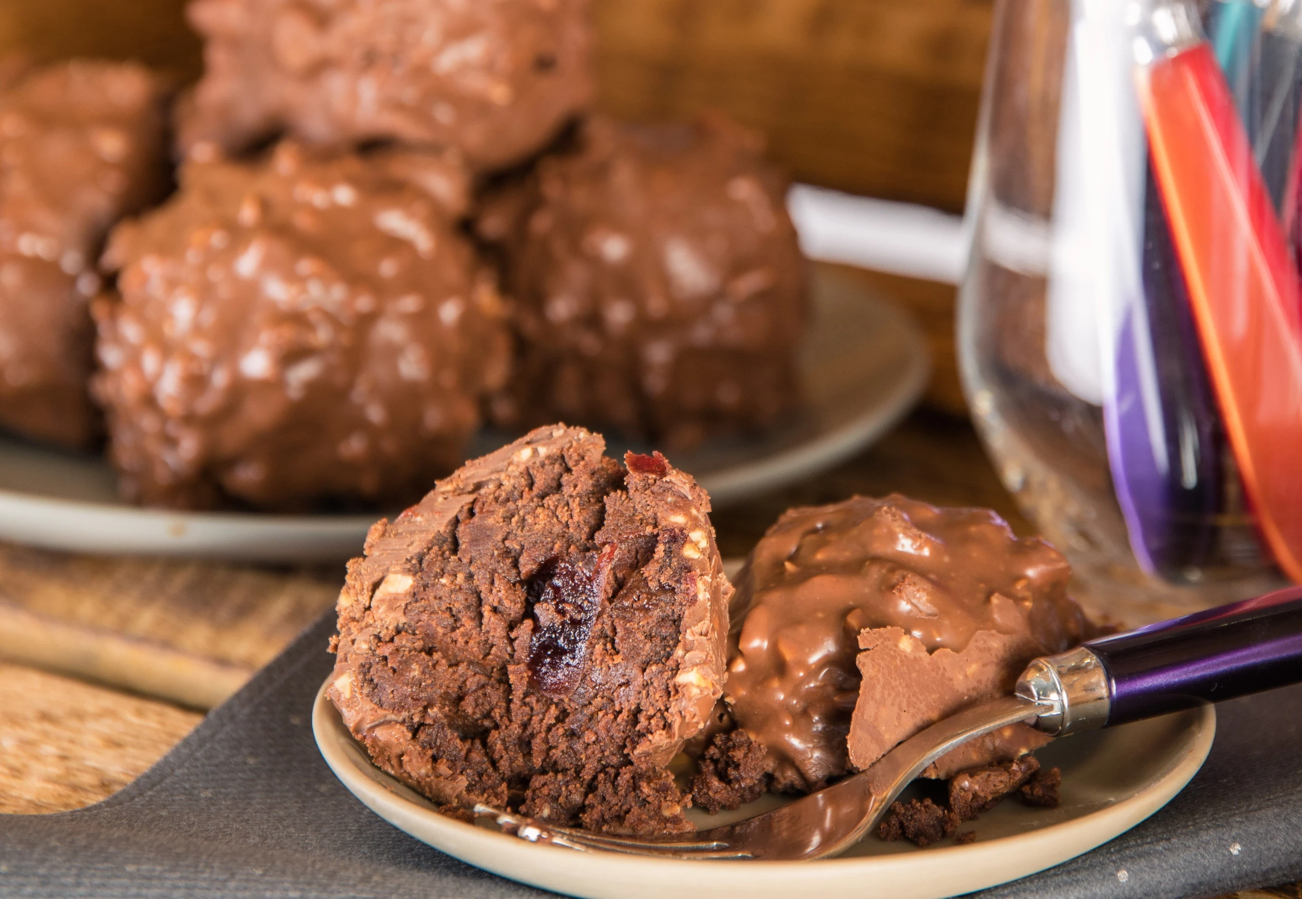 - Kuchen zerbröseln und mit der Nougatcreme und Rum verkneten. Masse in 18 Stücke teilen, mit je 1 Kirsche füllen, zu Bällchen rollen und für ca. 2 Stunden tiefkühlen.