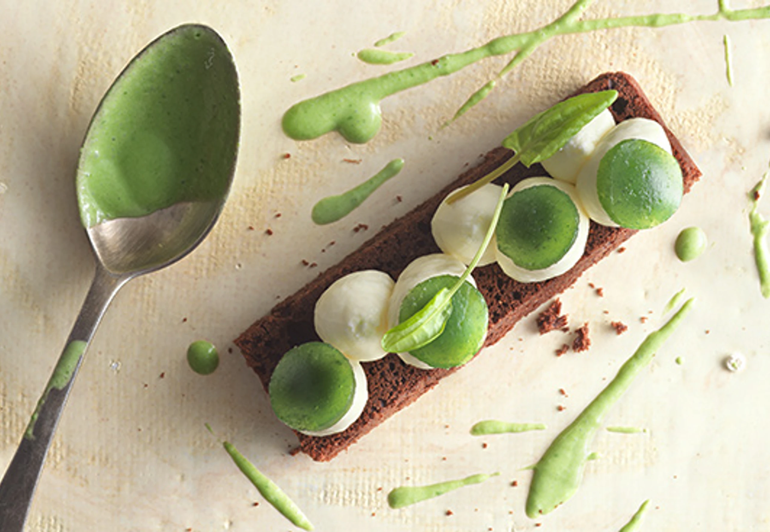 Aus dem Gelee Scheiben (Ø 2,5 cm) ausstechen. Schnitten mit Gelee und Sauce garnieren.