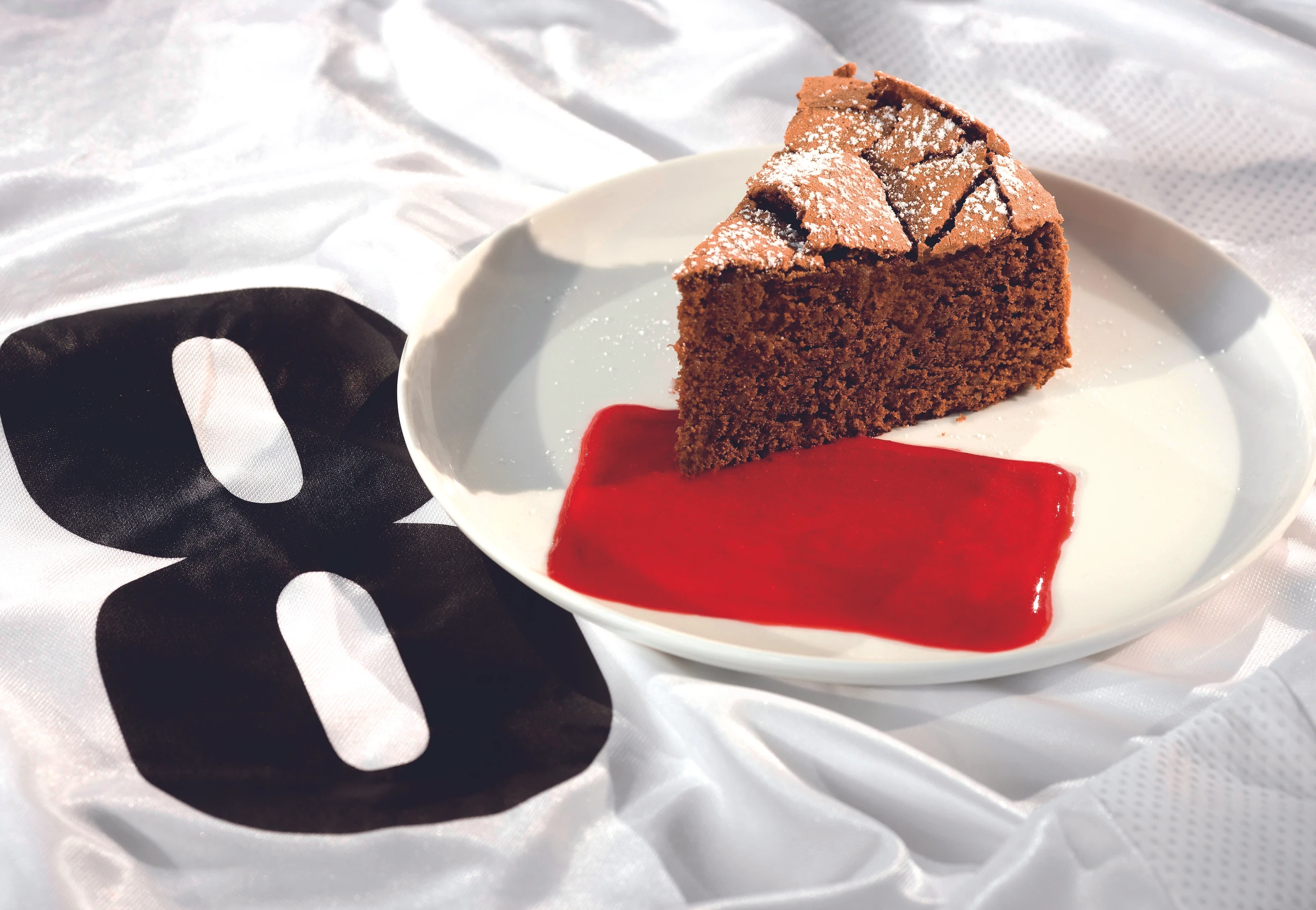 Beeren mit Zucker pürieren, mit einer Schablone in Kartenform auf Teller streichen. Kuchen mit Staubzucker bestreuen und auf der „roten Karte“ servieren.
