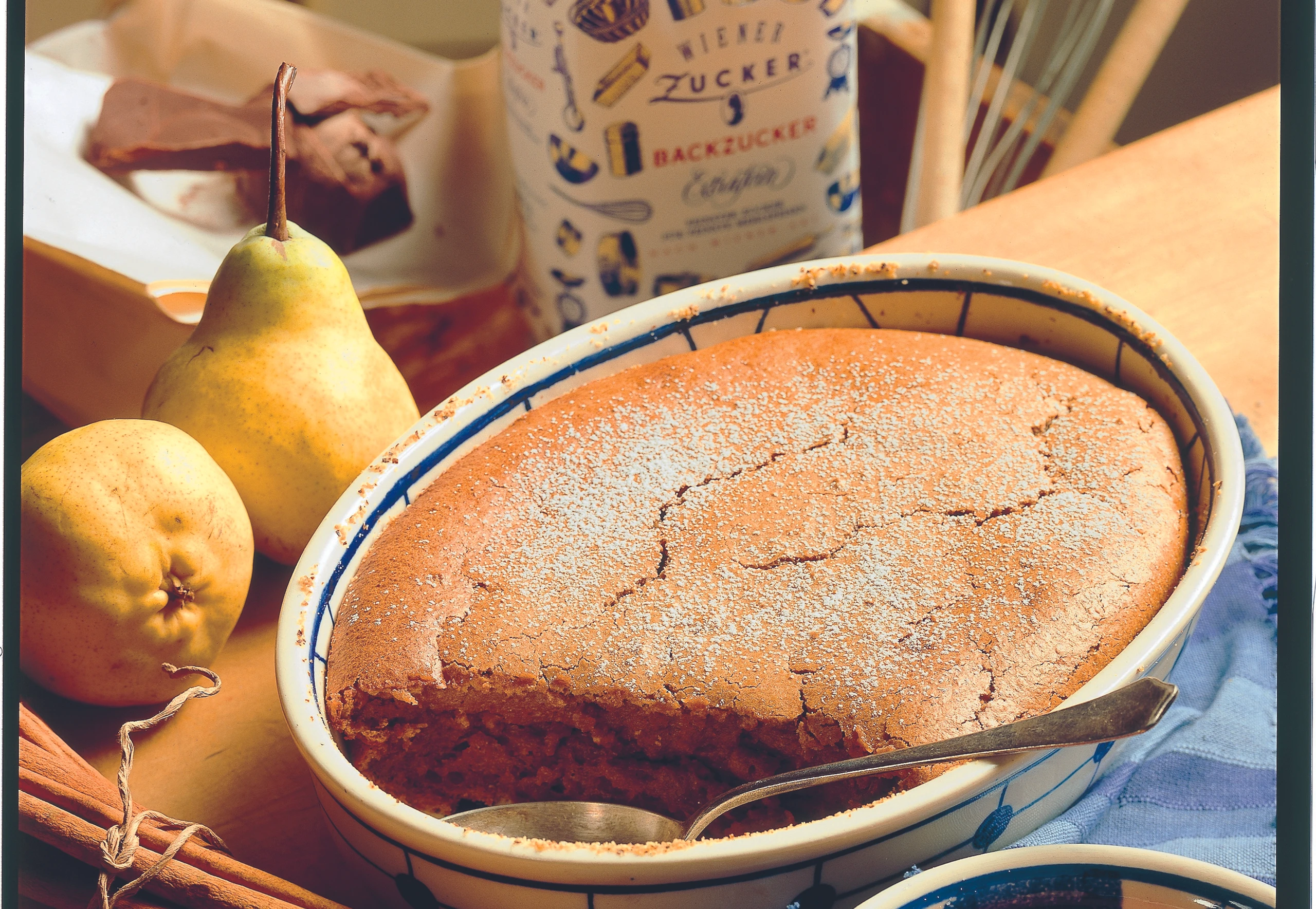 Auflauf aus dem Rohr nehmen, mit Staubzucker bestreuen und mit Rotweinbirnen (siehe Rezept) servieren.