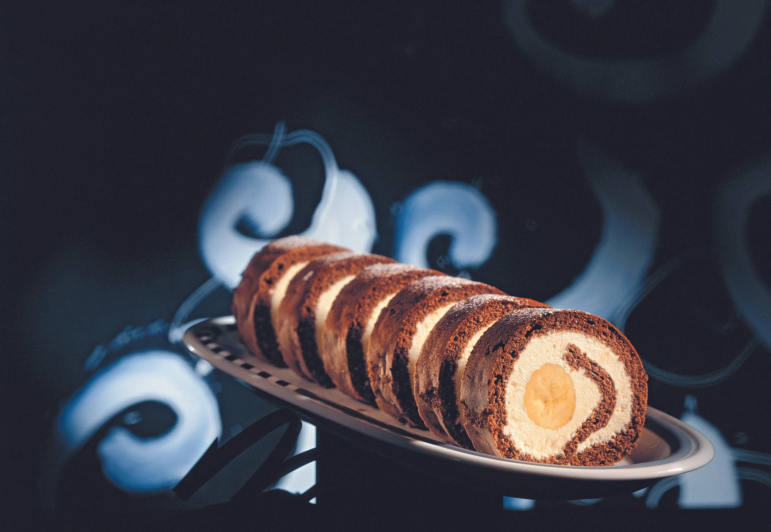 Backpapier vom Biskuit abziehen. Vanillecreme aufrühren und auf dem Biskuit verstreichen. Bananen schälen, mit wenig Zitronensaft beträufeln und am unteren Rand des Biskuits auflegen. Biskuit über die Bananen einrollen, mit Papier umwickeln und für ca. 1 Stunde kühl stellen.