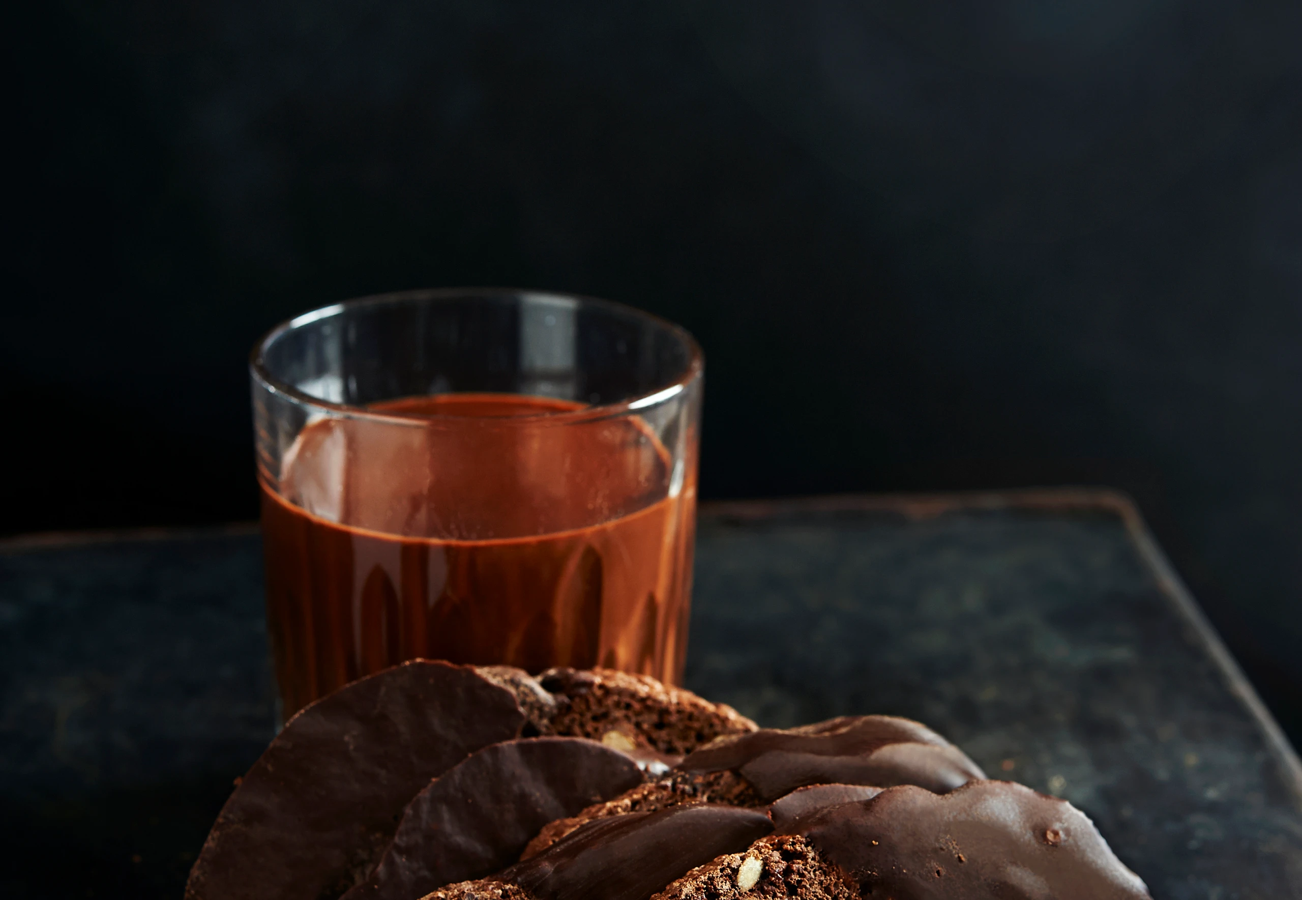 Kuvertüre über einem Wasserbad schmelzen, Biscotti bis zur Hälfte eintunken und auf Backpapier trocknen lassen.