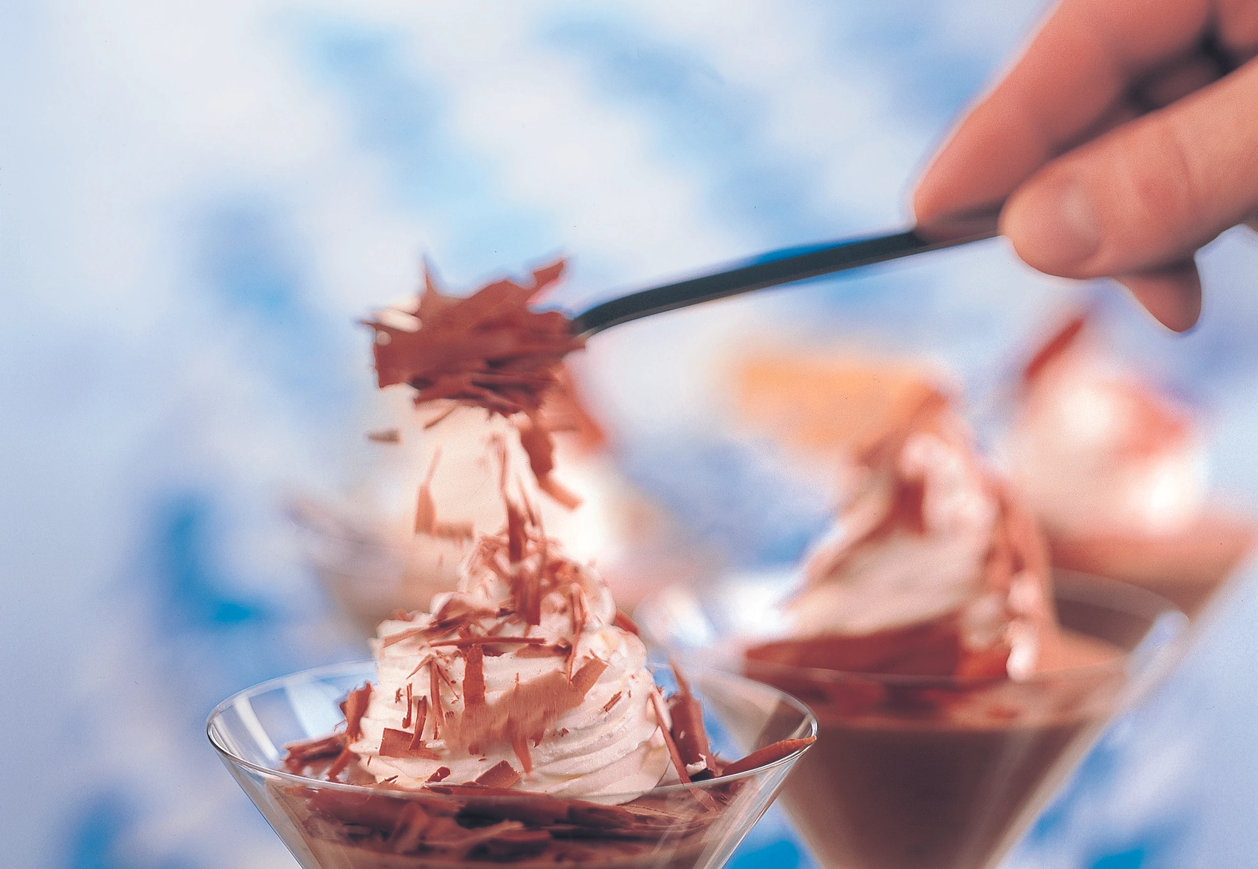 - Für die Garnitur Obers schlagen. Cremen mit Obers und Schokoladespänen garnieren.