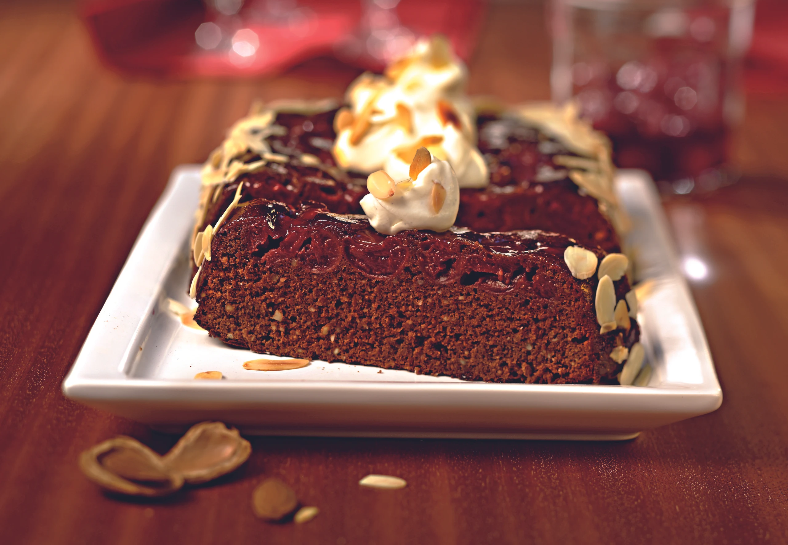 Kuchen aus dem Rohr nehmen, stürzen und auskühlen lassen. Mit geschlagenem Obers und Mandeln garnieren.