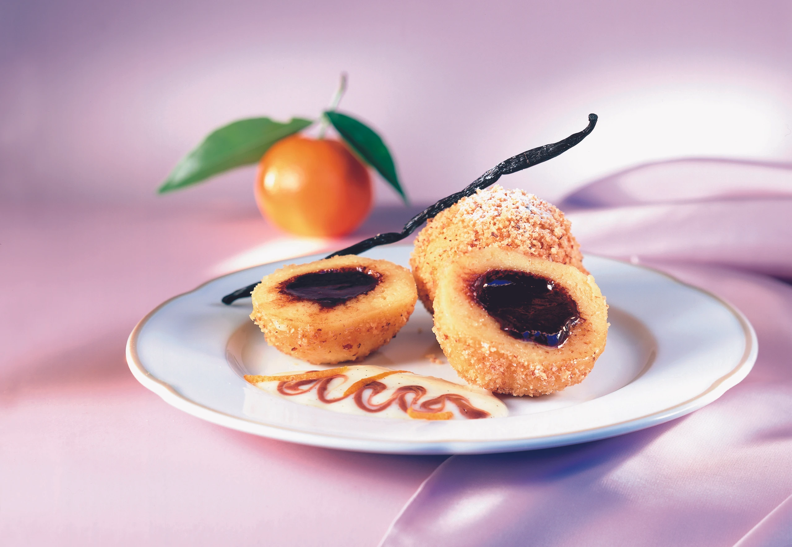 Während die Knödel kochen, die gerösteten Haselnüsse fein hacken und mit Zucker vermischen. Knödel mit einem Siebschöpfer aus dem Kochwasser heben, gut abtropfen lassen und in den Nüssen wälzen. Knödel auf Tellern anrichten, mit Staubzucker bestreuen und mit Vanillesauce servieren.