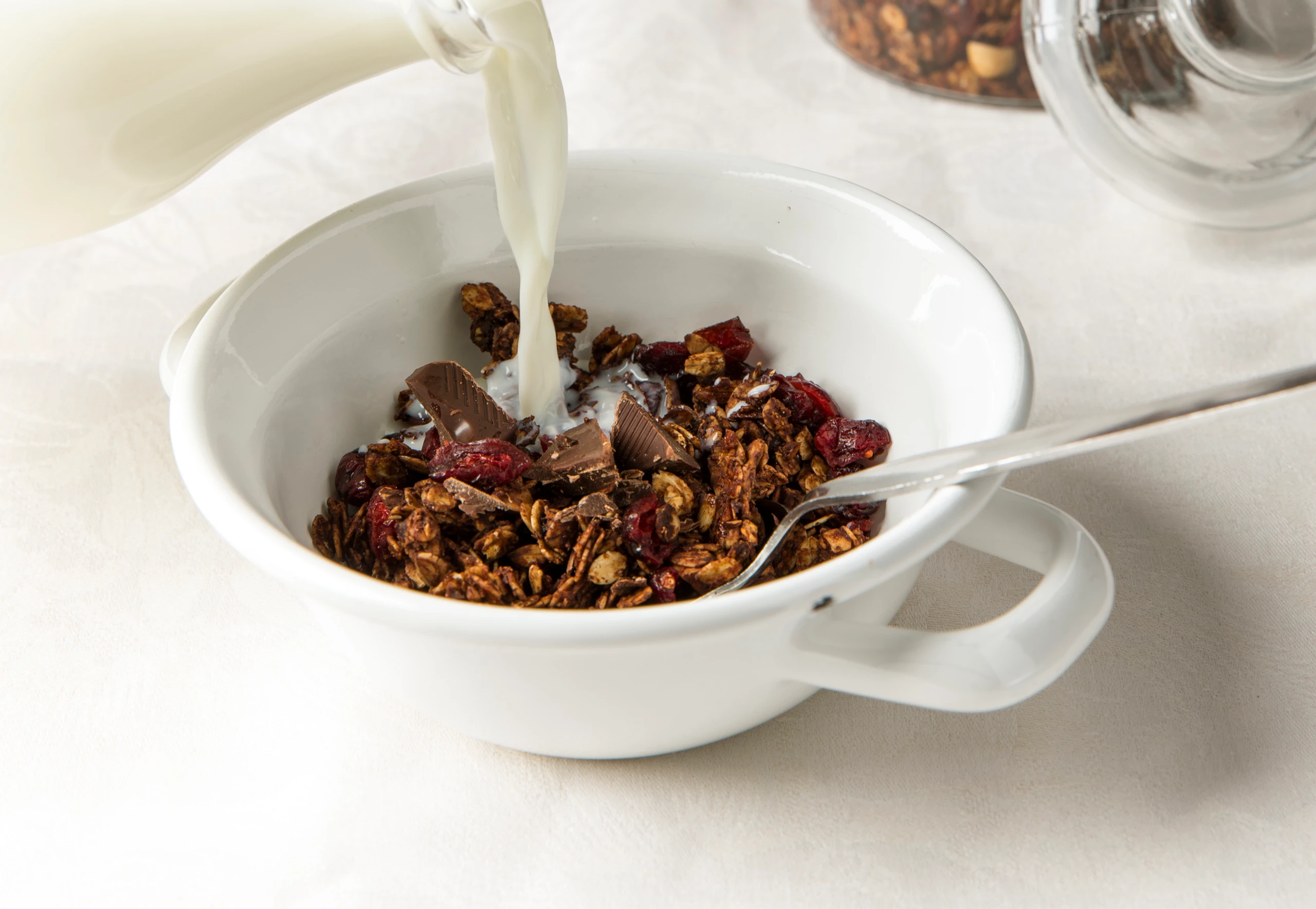 Herausnehmen und abkühlen lassen. Kuvertüre und Cranberrys untermischen. Granola in einen luftdichten Behälter füllen, so hält es mehrere Monate.
