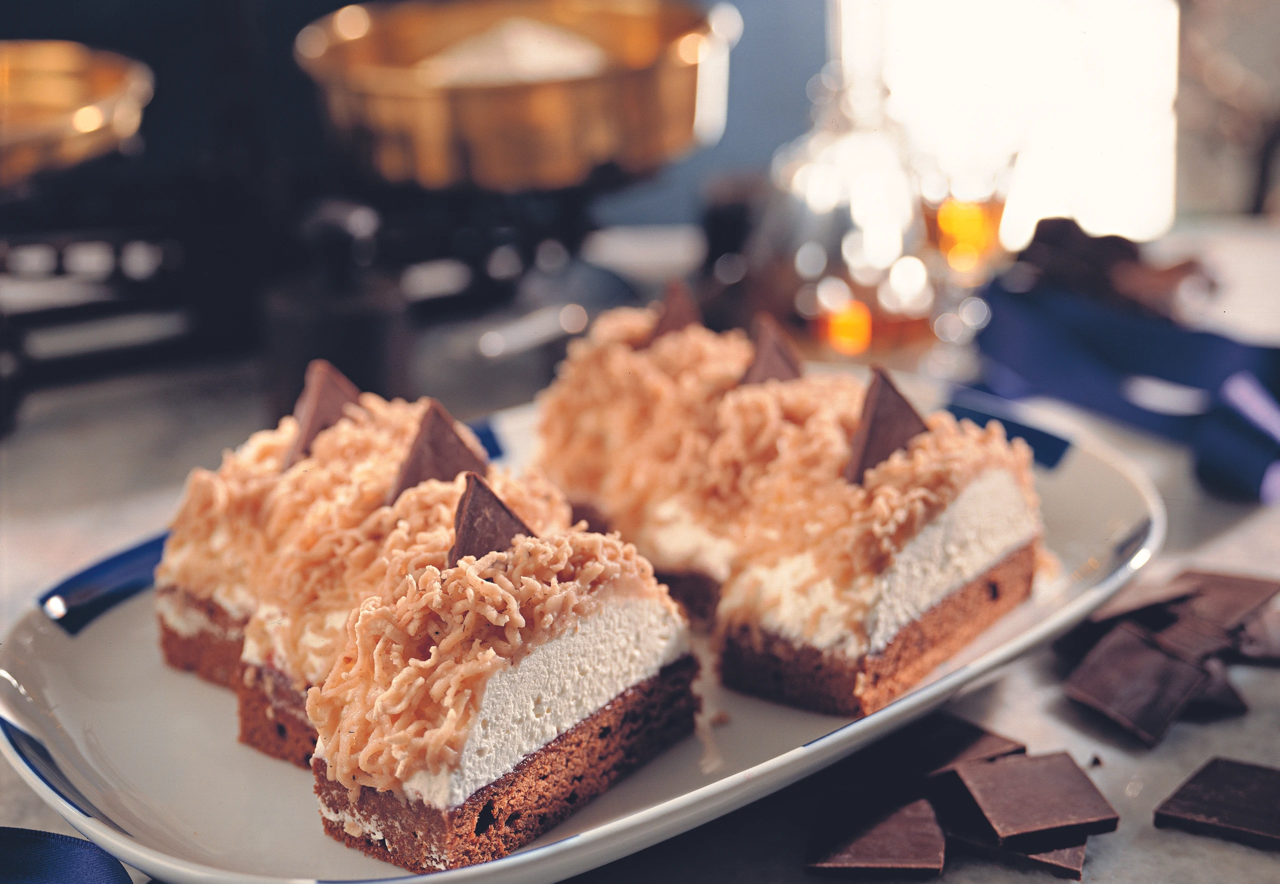 Maronischnitte eventuell noch zusätzlich mit kleinen Schokoladeblättchen oder mit Schokoladestreusel garnieren.