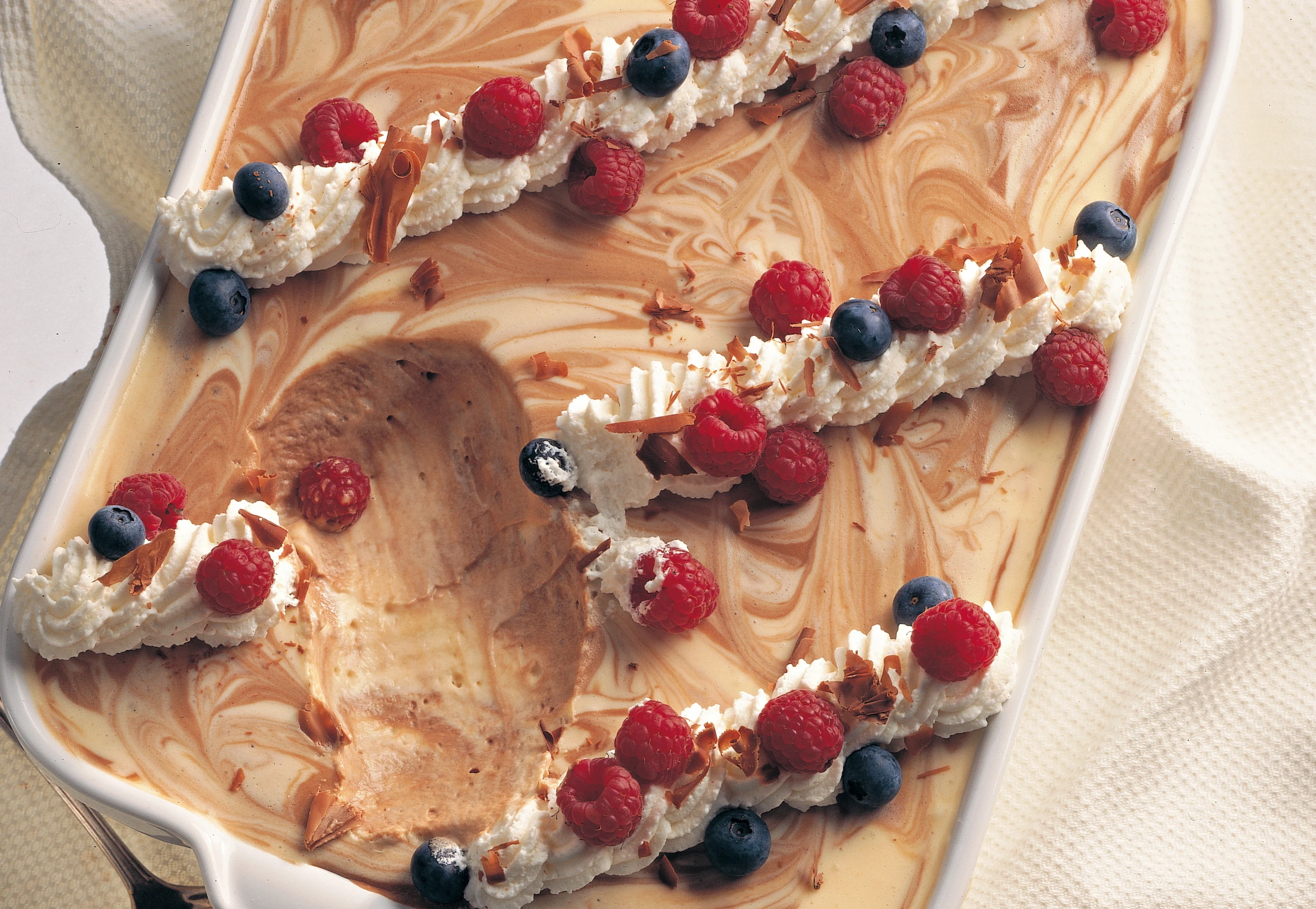 Zuerst dunkle, dann helle Mousse in eine Schüssel füllen und mit einem Kochlöffelstiel behutsam durchrühren, sodaß eine marmorierte Masse entsteht.
