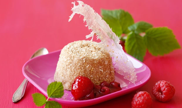 - Für das Beerenragout Ribiseln, 100 ml Wasser, Gelierzucker und Zitronensaft vermischen und ca. 15 Minuten köcheln. Mischung umfüllen, Himbeeren zugeben, Ragout auskühlen lassen.