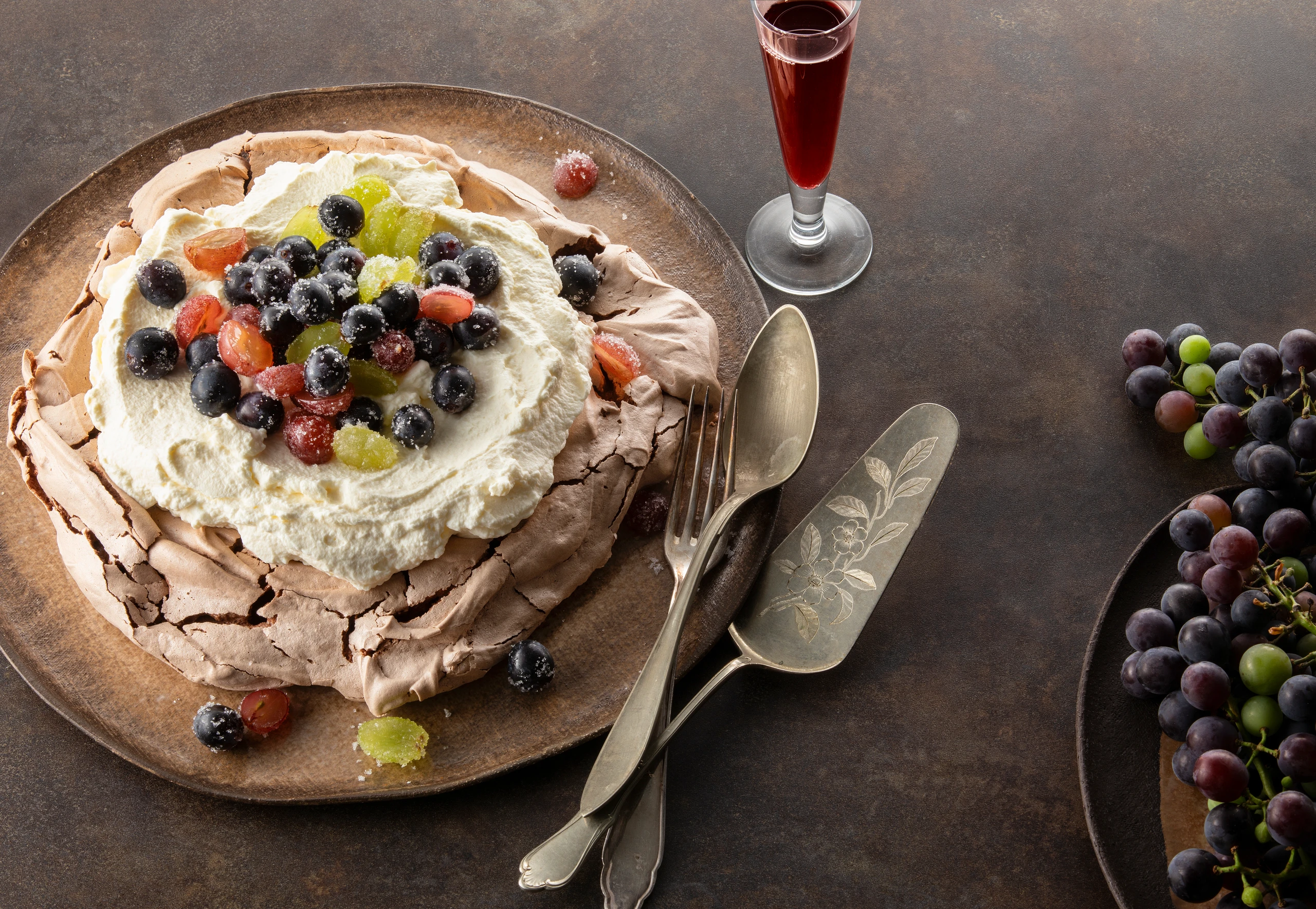 Für den Belag Obers, Crème fraîche und Zucker cremig schlagen. Creme auf der Pavlova verstreichen. Trauben mit wenig Zucker vermischen und auf der Pavlova verteilen.