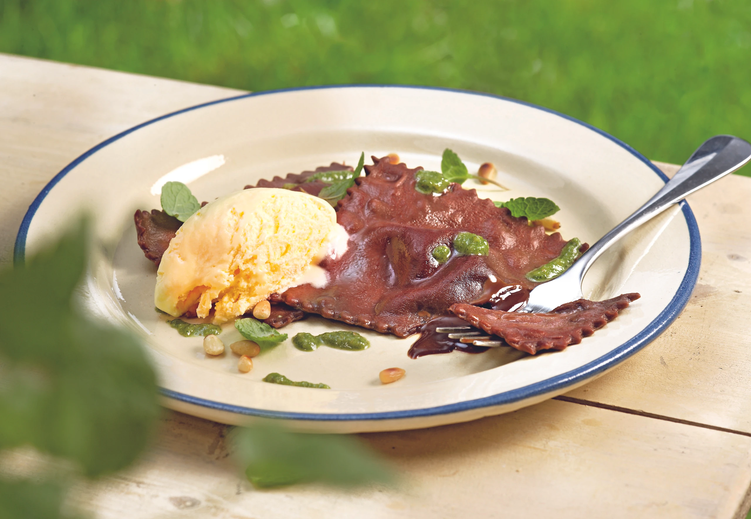 Leicht gesalzenes Wasser aufkochen. Ravioli einlegen und ca. 4 Minuten kochen. Ravioli herausheben, abtropfen lassen, mit Pesto, Pinienkernen und Minze bestreut servieren. Eventuell mit Eis garnieren.