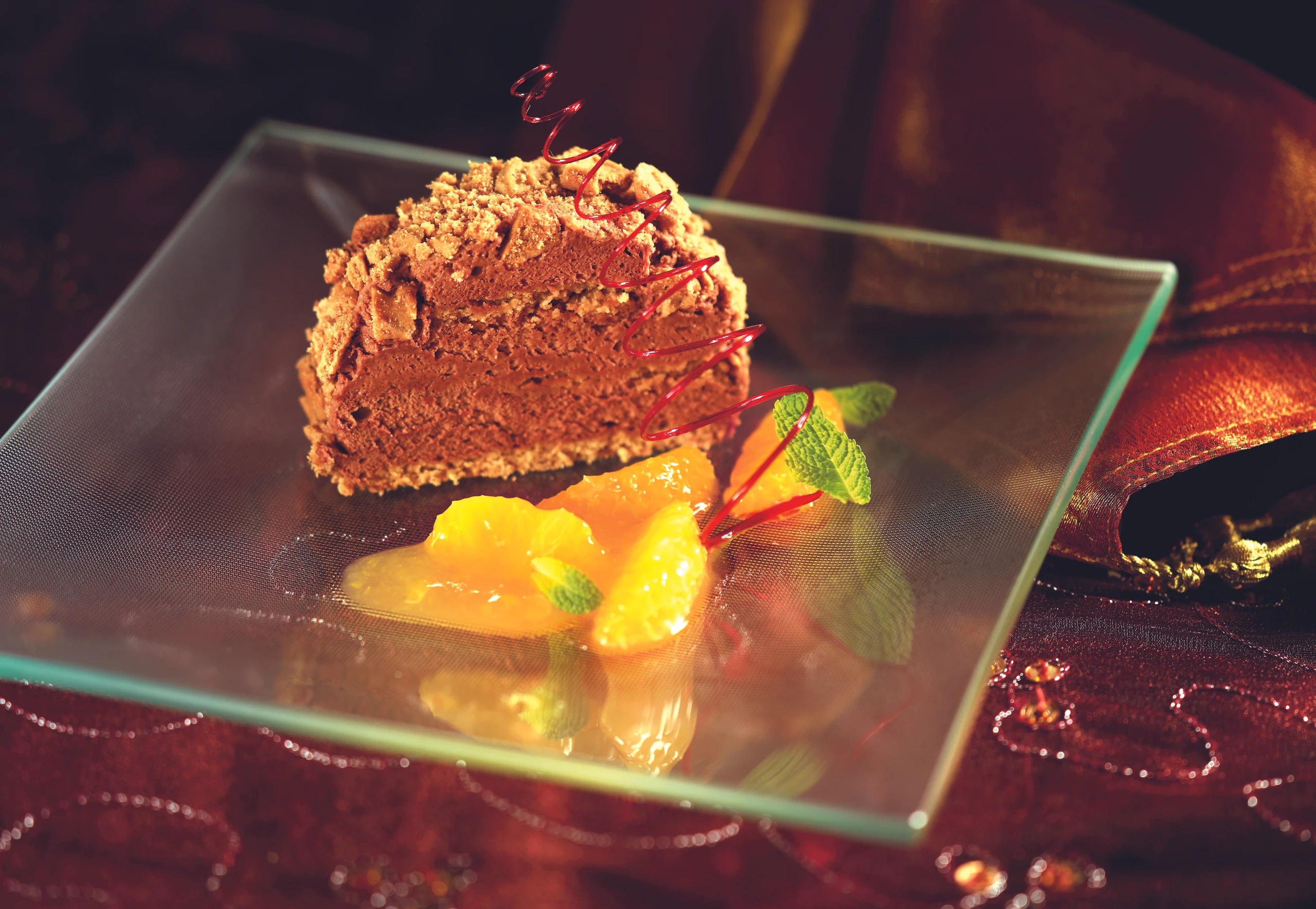 Ein Drittel vom Schokomousse in der Form verteilen, mit einem Drittel der ganzen Spekulatius belegen. Spekulatius mit wenig Mandarinensaft beträufeln. Diesen Vorgang mit restlichen Zutaten wiederholen. Mit einer Schicht Spekulatius abschließen. Terrine mit Frischhaltefolie zudecken und zum Festwerden für ca. 5 Stunden kühl stellen.
