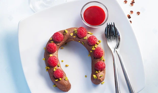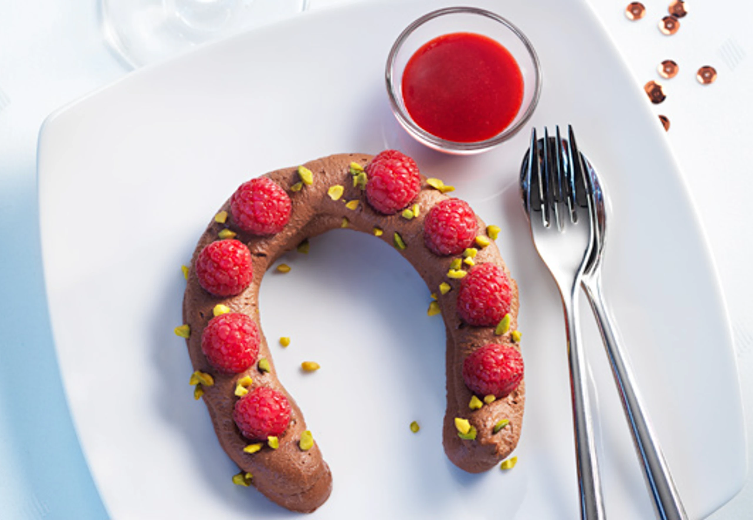 Schokolademousse mit einem Schneebesen dickcremig aufrühren und in einen Dressiersack (glatte Tülle) füllen. Schokolademousse in Form von Hufeisen auf die Teller dressieren, mit Himbeeren und Pistazien garnieren. Mit Himbeersauce servieren.