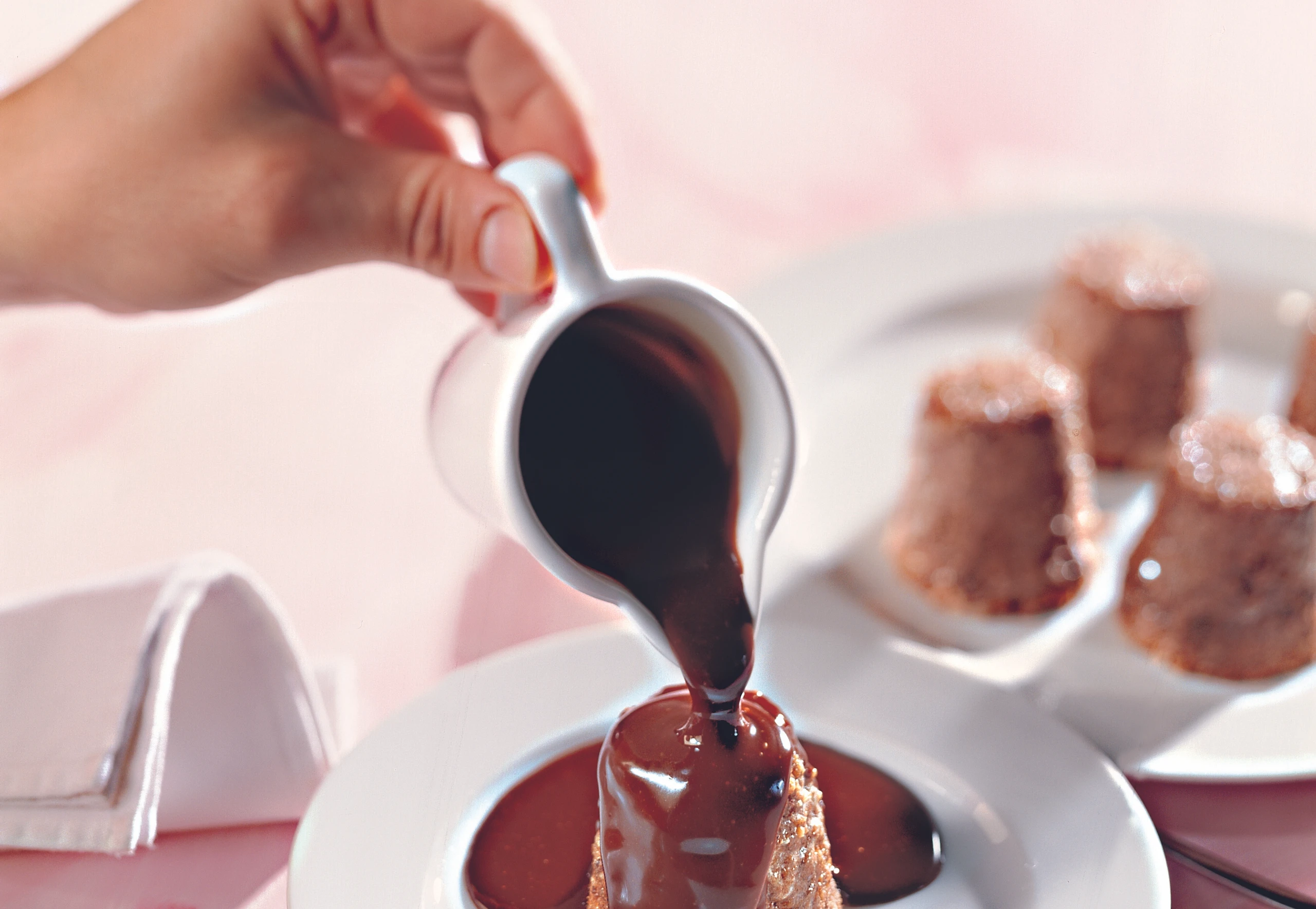 Für die Garnitur Schokoladesauce erwärmen, Obers cremig aufschlagen. Förmchen aus dem Rohr nehmen, Desserts auf Teller stürzen und mit Schokosauce und Obers garniert servieren.