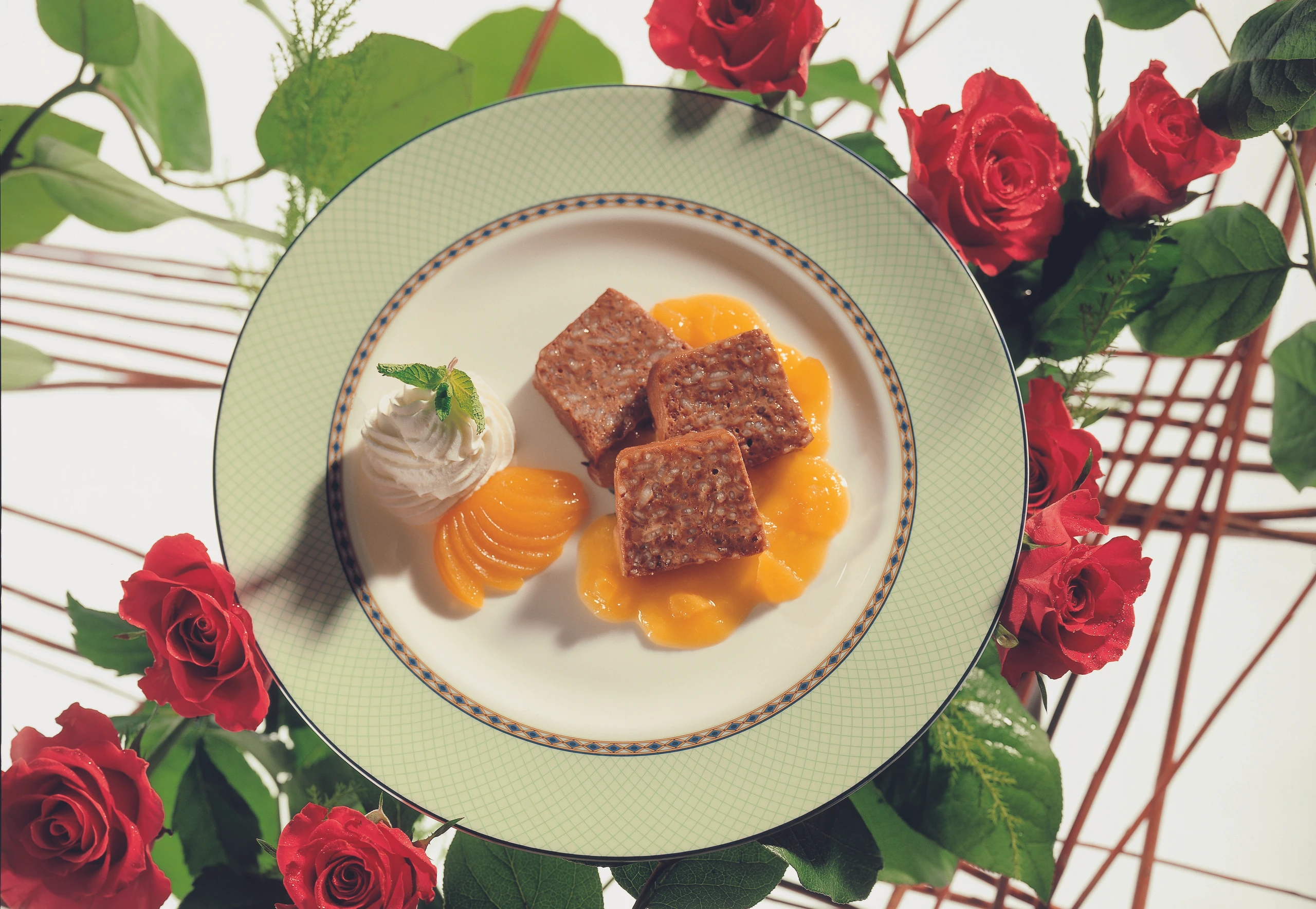 Vor dem Servieren Kompottmarillen gut trocken tupfen und in kurzen Abständen fächerförmig einschneiden. Obers schlagen. Terrine mit Hilfe der Folie aus der Form stürzen und in Scheiben schneiden. Mit der Marillensauce (siehe Rezept) anrichten und mit Obers, Marillenfächern und Minze garniert servieren.
