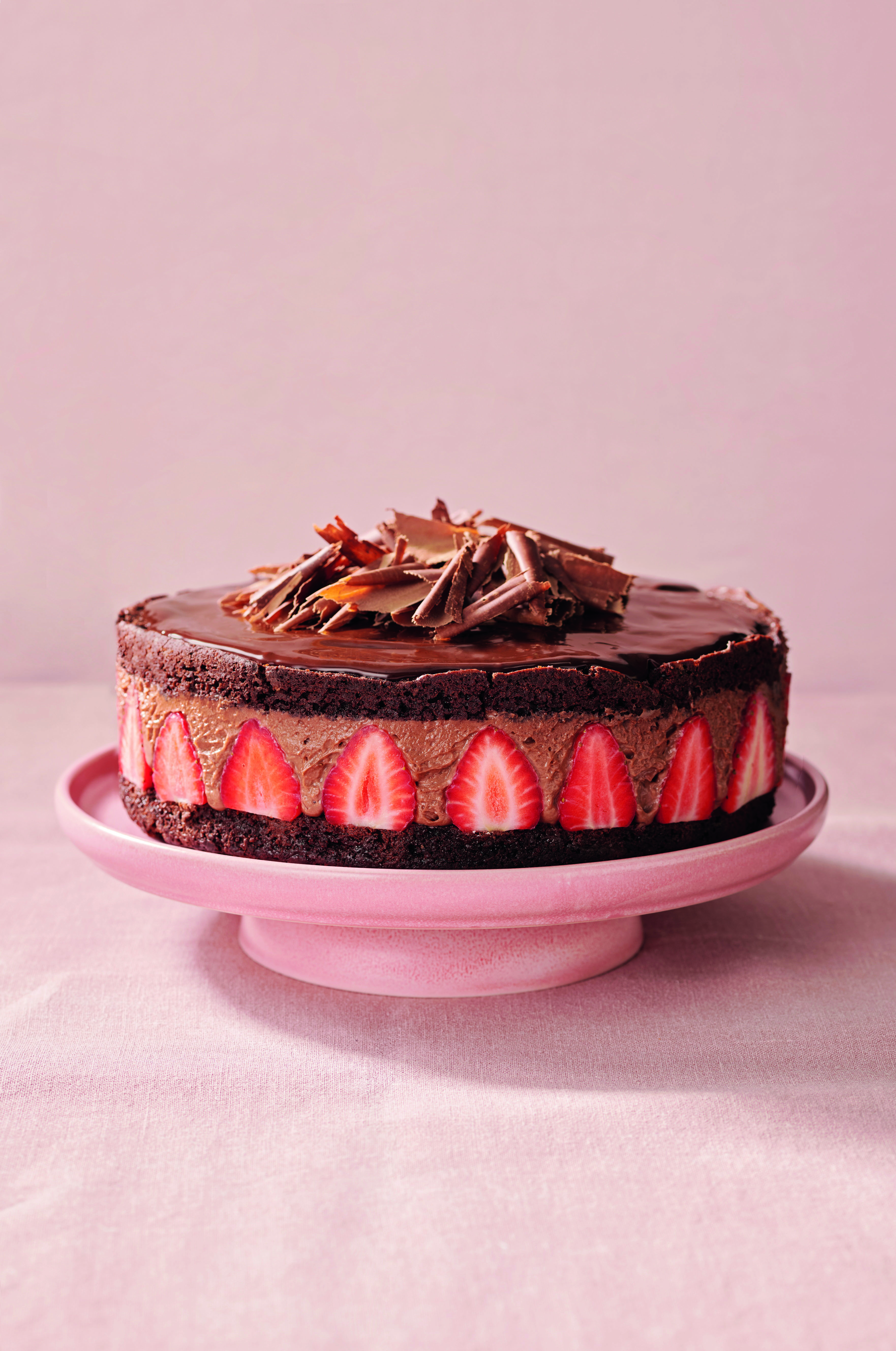 Für den Kuchen Butter und Kuvertüre schmelzen. Zucker, Kakao und heißes Wasser unterrühren. Eier und Mehl untermischen. Masse in der Form verstreichen und im Rohr (2. Schiene von unten / Gitterrost) ca. 40 Minuten backen. Herausnehmen, überkühlen lassen und kalt stellen.