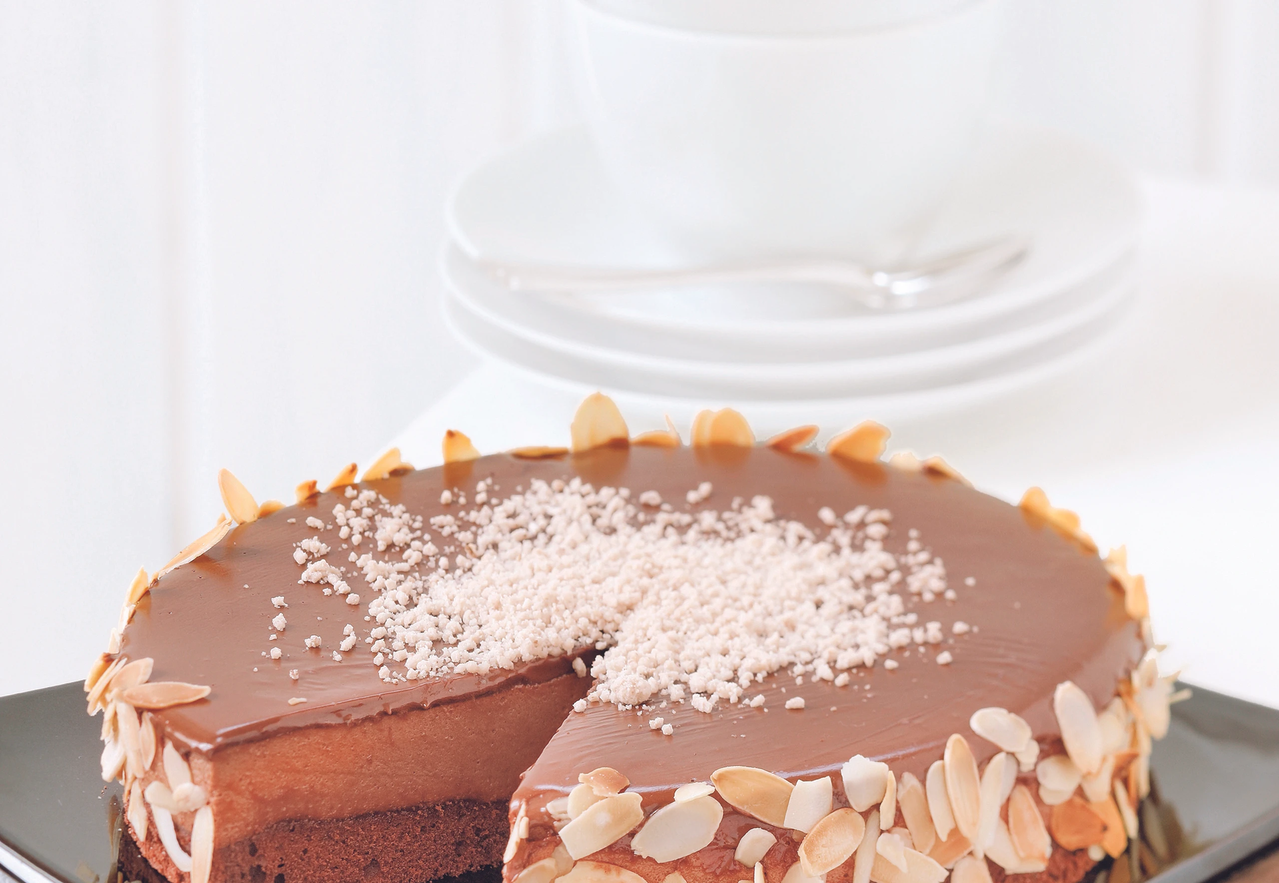 - Für die Glasur Nougat über Dampf schmelzen, über die Torte gießen, mit einer Palette verstreichen und fest werden lassen. Torte mit einem kleinen Messer vom Formenrand schneiden. Form öffnen und abheben. Mandelblättchen gleichmäßig auf dem Tortenrand verteilen. Torte mit dem übrigen Kastanienreis bestreuen.