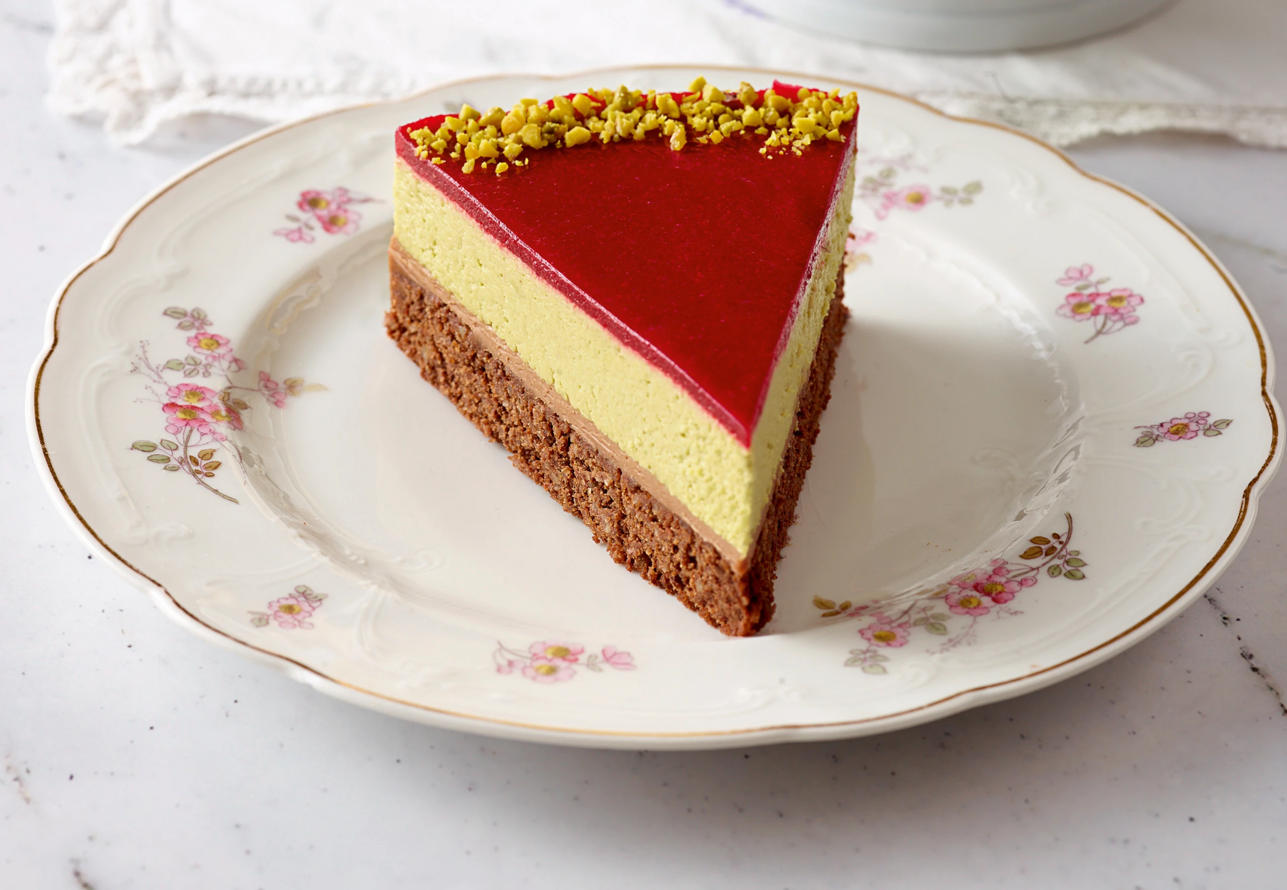 Schokoladige Pistazienmoussetorte mit Himbeerspiegel