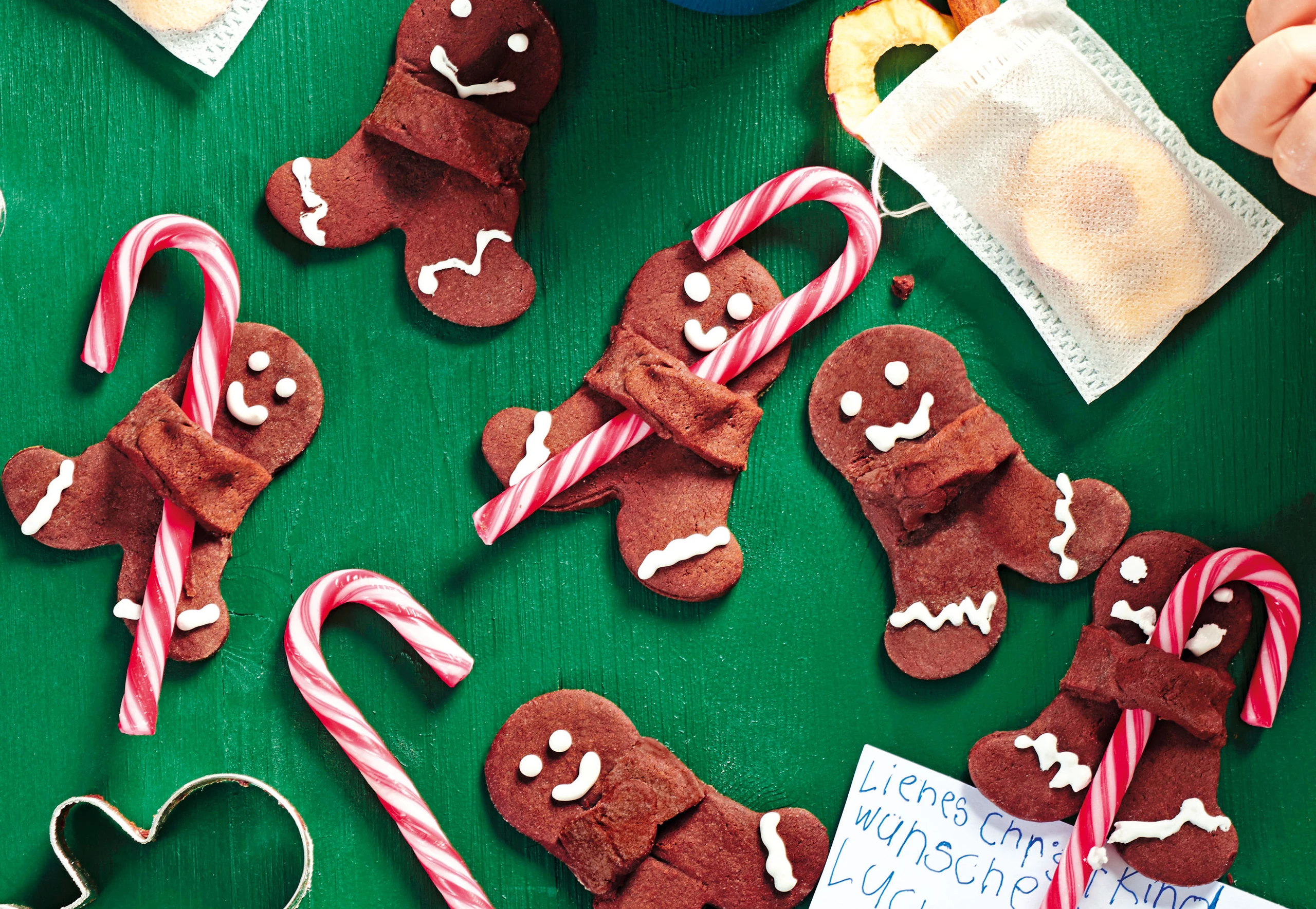 Teig auf einer leicht bemehlten Arbeitsfläche ausrollen und mit einem Ausstecher Lebkuchenmännchen ausstechen. Kekse auf das Blech legen. Backpapierstücke zusammenrollen, die „Arme“ vom Lebkuchenmännchen darüber schlagen und vorsichtig zusammendrücken. Im Rohr (mittlere Schiene) ca. 10 Minuten backen. Herausnehmen und abkühlen lassen. Backpapierröllchen entfernen und die Zuckerstangen vorsichtig hineinschieben.