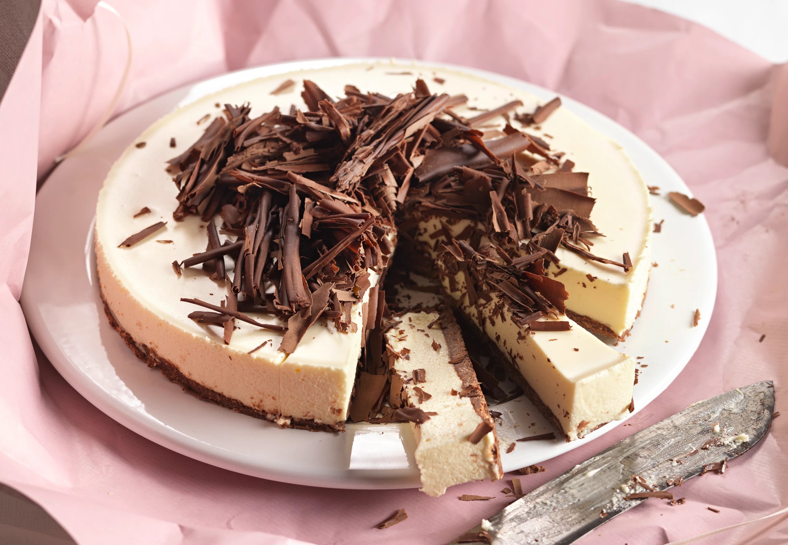 Torte aus der Form nehmen, mit Schokospänen garnieren und portionieren.