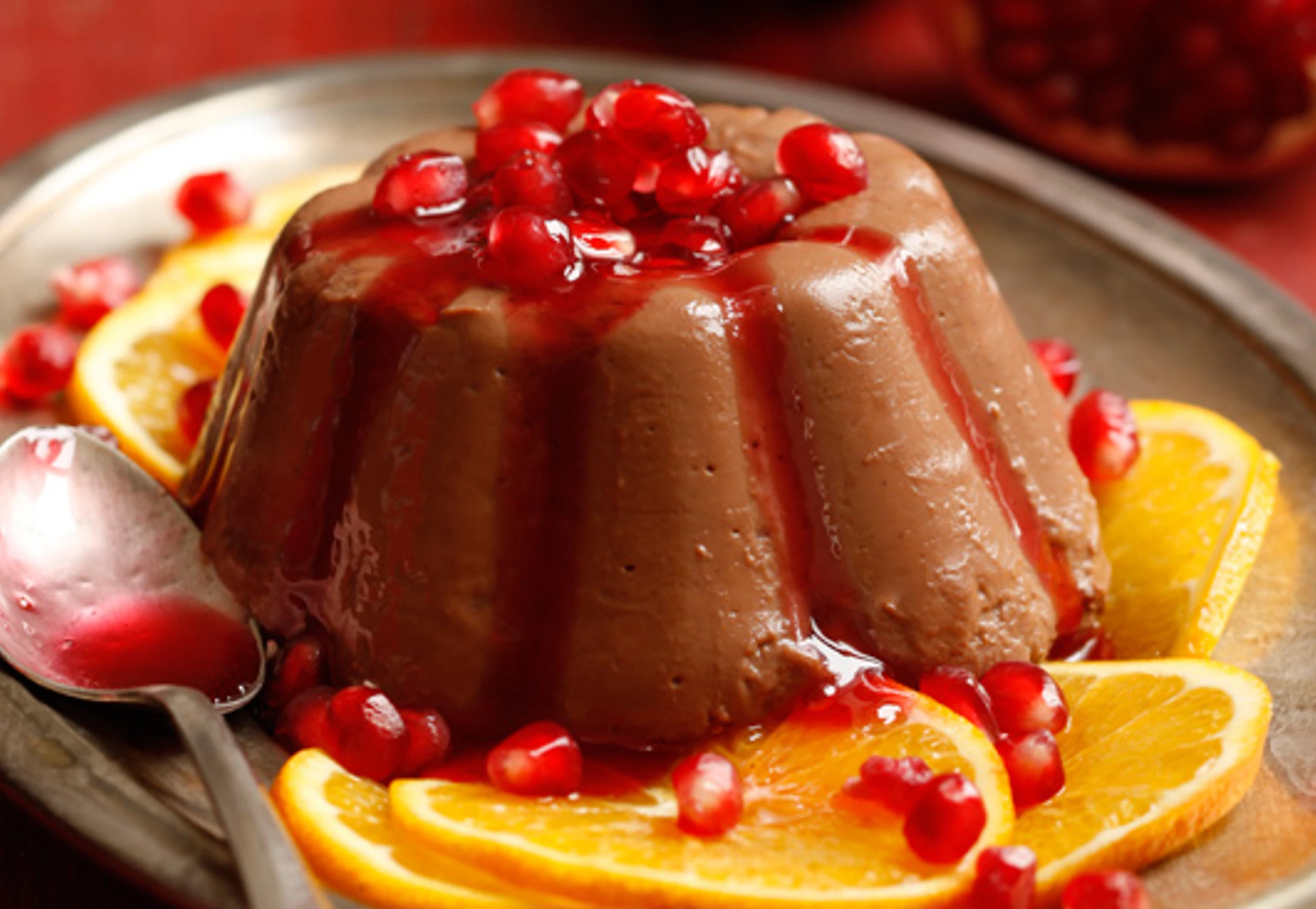 - Orangenscheiben und Sirup auf Teller geben. Pudding aus der Form stürzen und darauf setzen. Mit Granatapfelkernen bestreuen, mit Granatapfelsirup beträufeln.