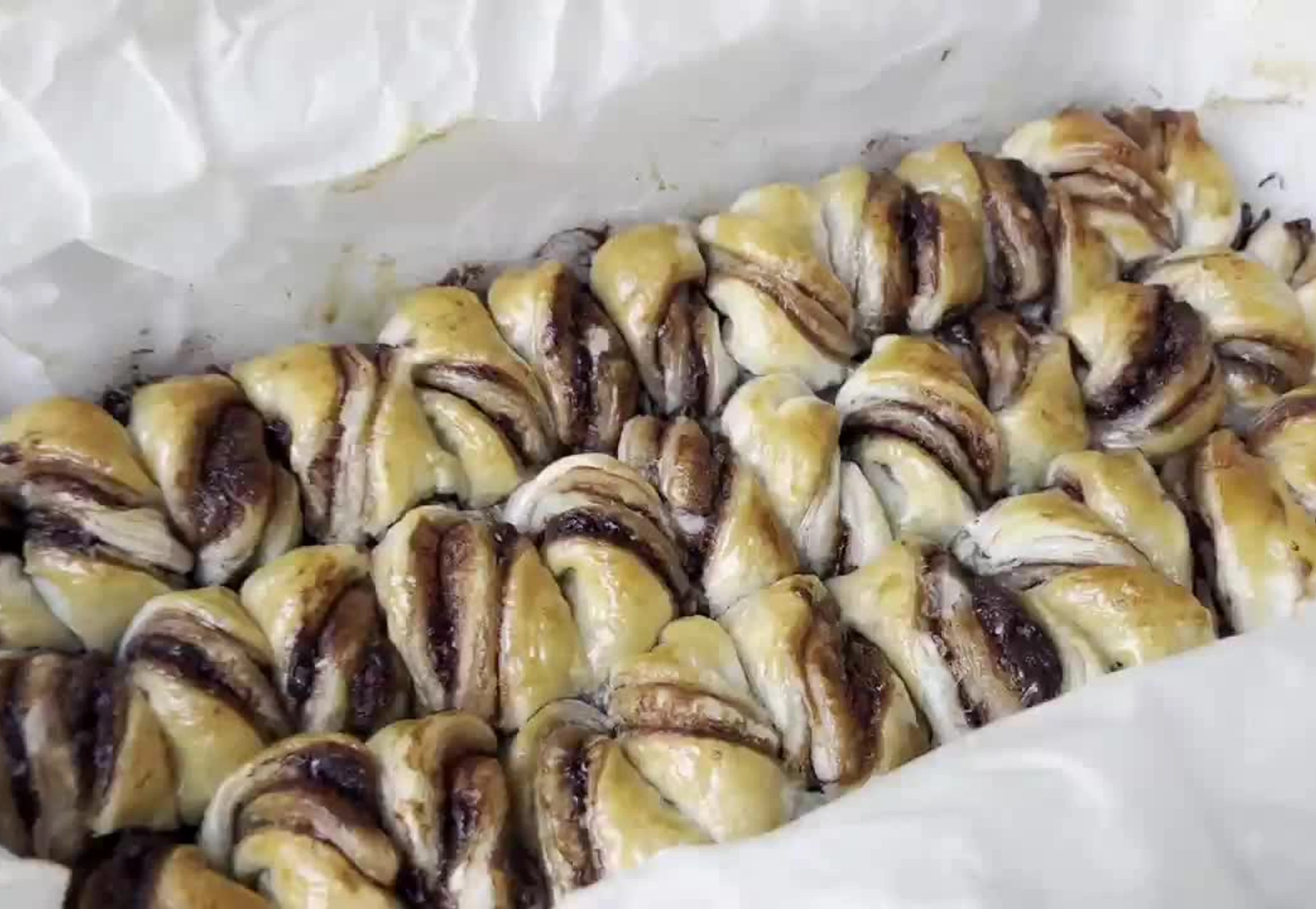 Nun vom Rand aus aufrollen, damit Röllchen entsteht. Vorgang mit zweitem Blätterteig und restlicher Creme wiederholen.