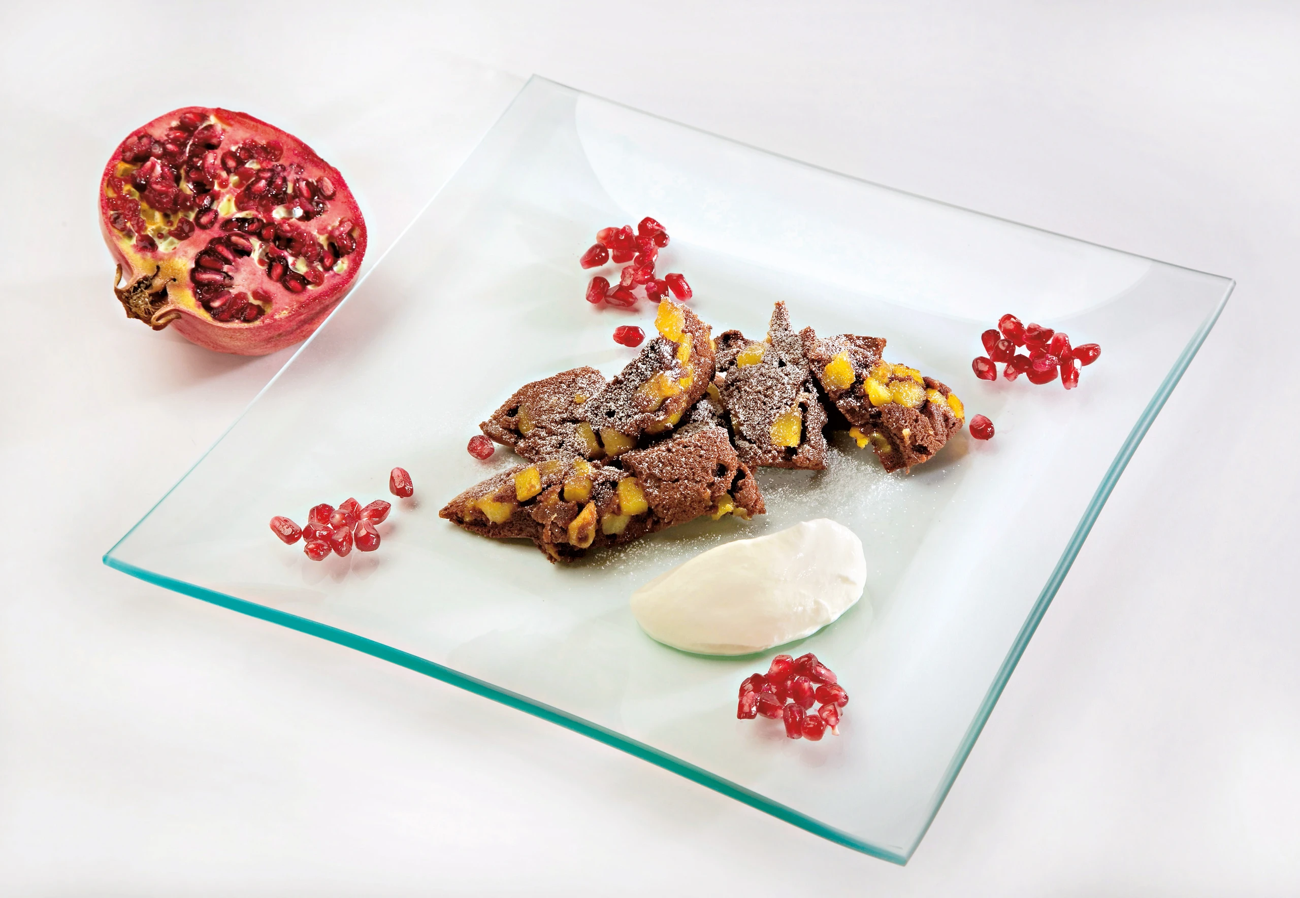 Schmarren auf ein Blech stürzen, kurz rasten lassen und in Stücke schneiden oder Motive ausstechen. Obers leicht schlagen, Schmarren darauf anrichten, mit Granatapfelkernen bestreuen.