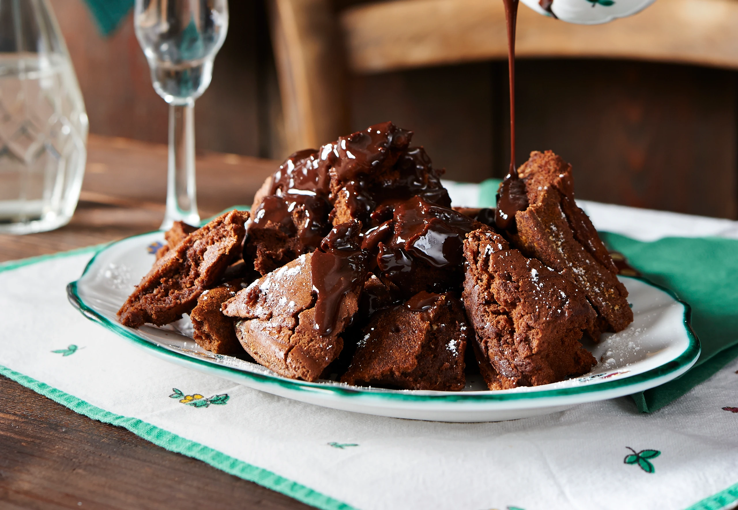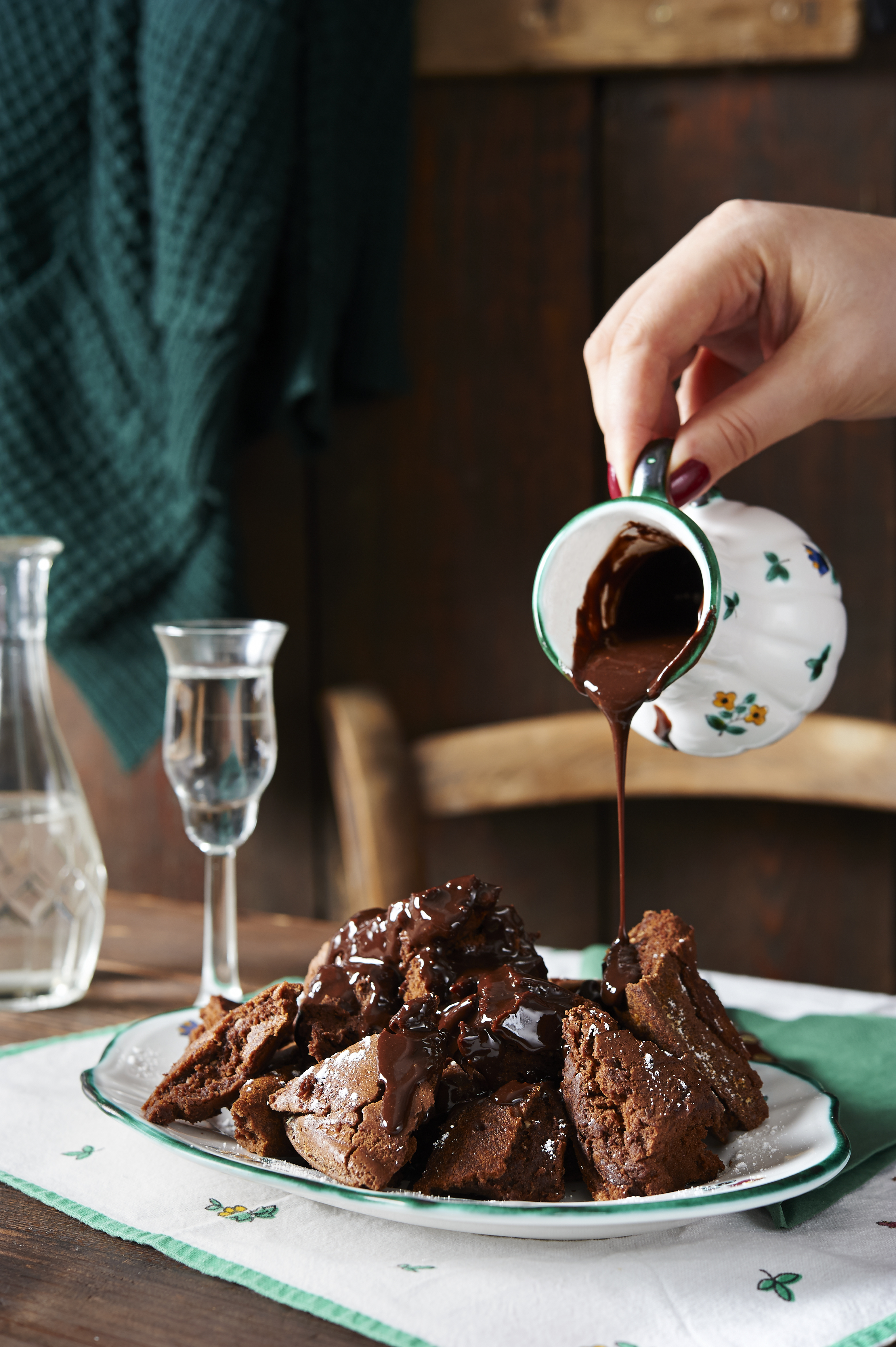Herausnehmen und in Stücke teilen. Schokoschmarrn mit Staubzucker bestreuen und mit der warmen Nougatsauce servieren.