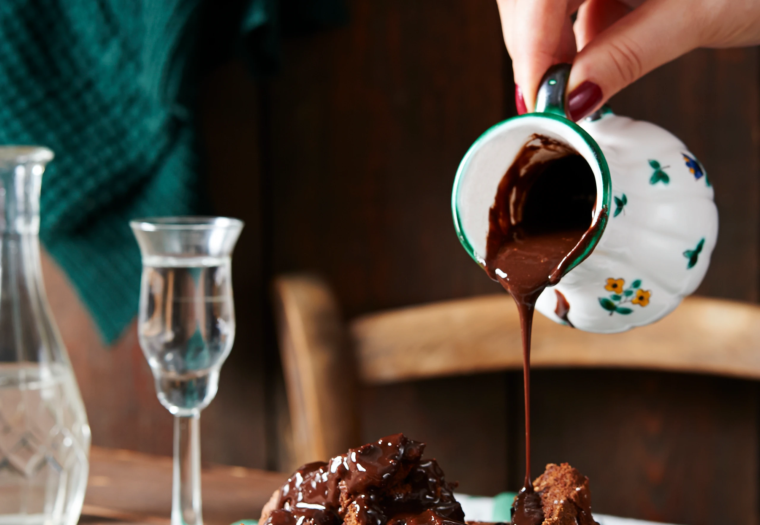 Für die Sauce Obers aufkochen und vom Herd nehmen. Nougatcreme und Kuvertüre zugeben und glatt rühren.
