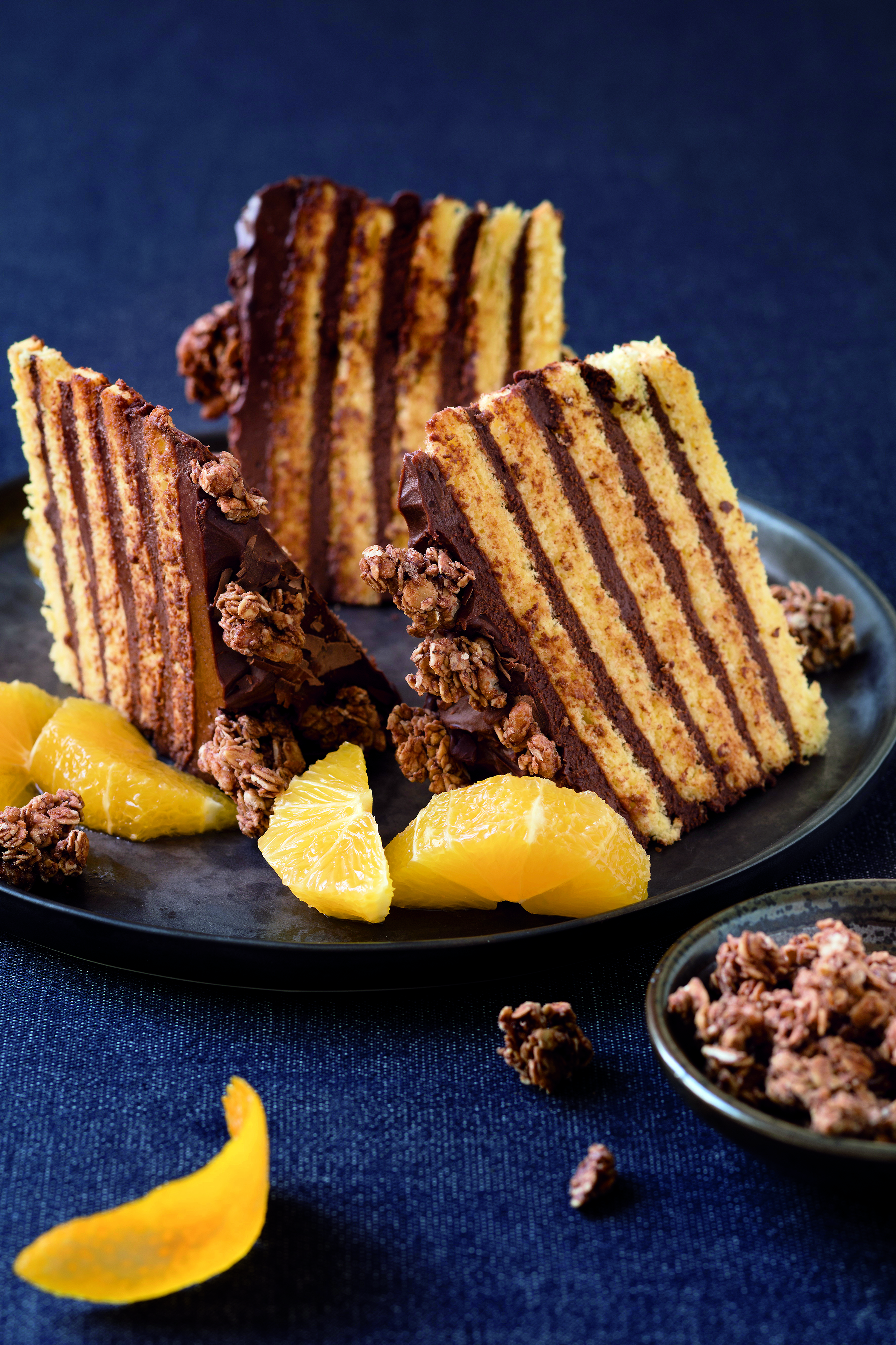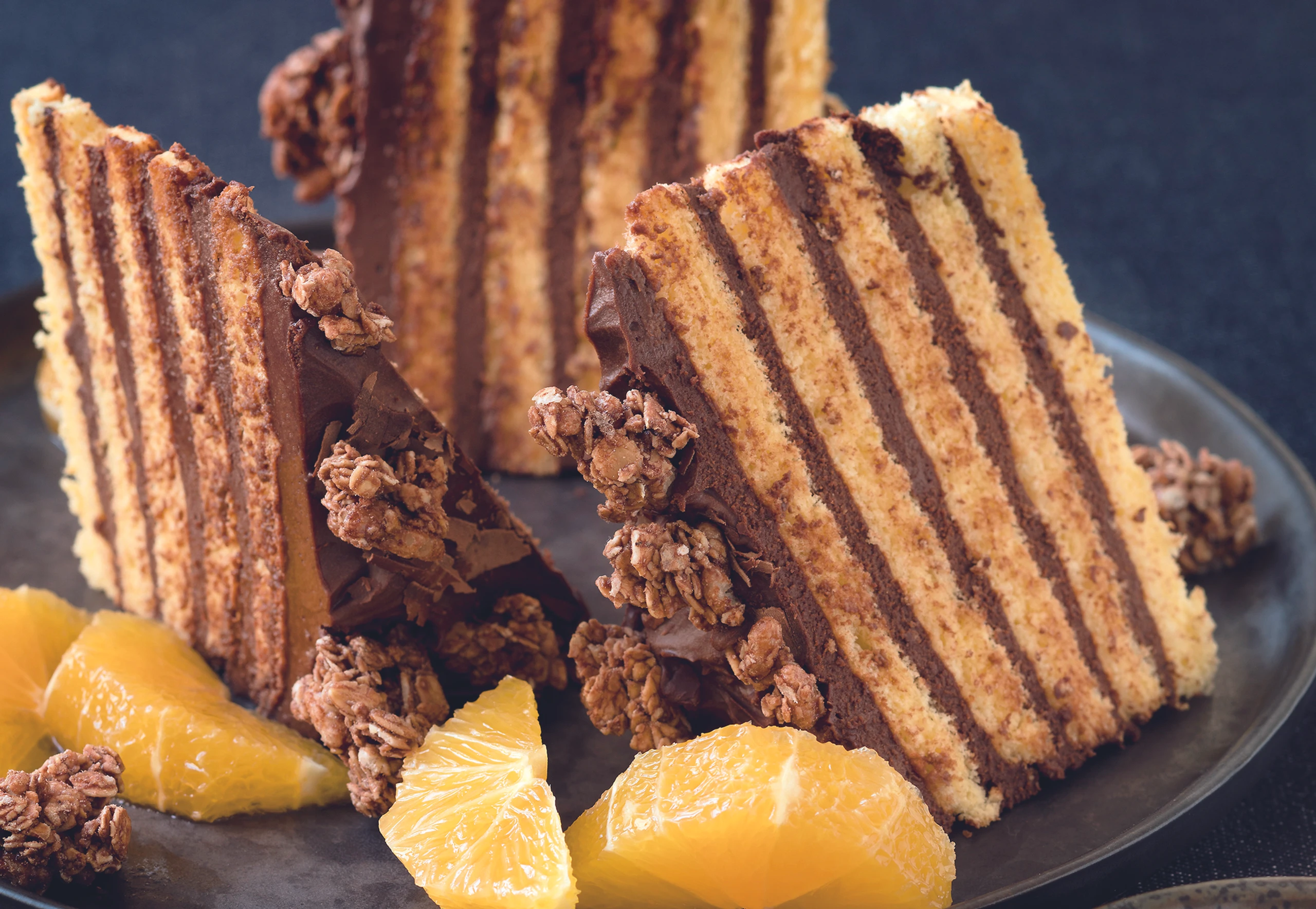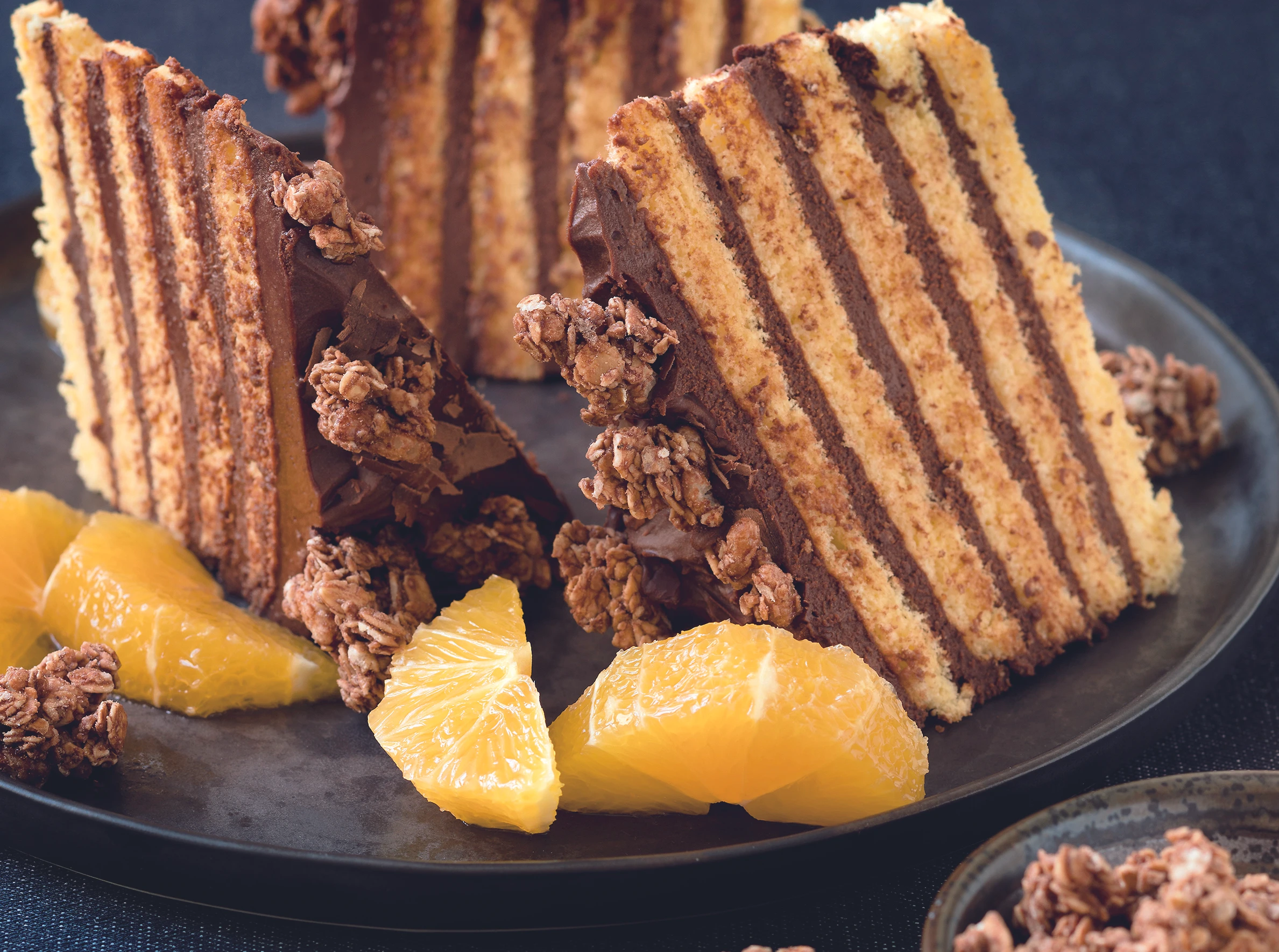 Schnitte in 5 Portionen schneiden und nochmals diagonal halbieren. Orangen so schälen, dass auch die weiße Innenhaut entfernt wird und in Spalten schneiden. Schnitten mit Orangenstücken und Crunchies garniert servieren.