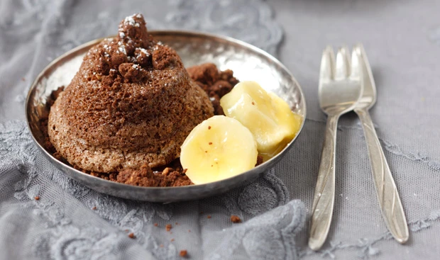 - Zwei Drittel von den Nussflocken anrichten. Soufflés darauf stürzen, mit Staubzucker bestreuen und mit Bananenscheiben und übrigen Nussflocken garniert rasch servieren.